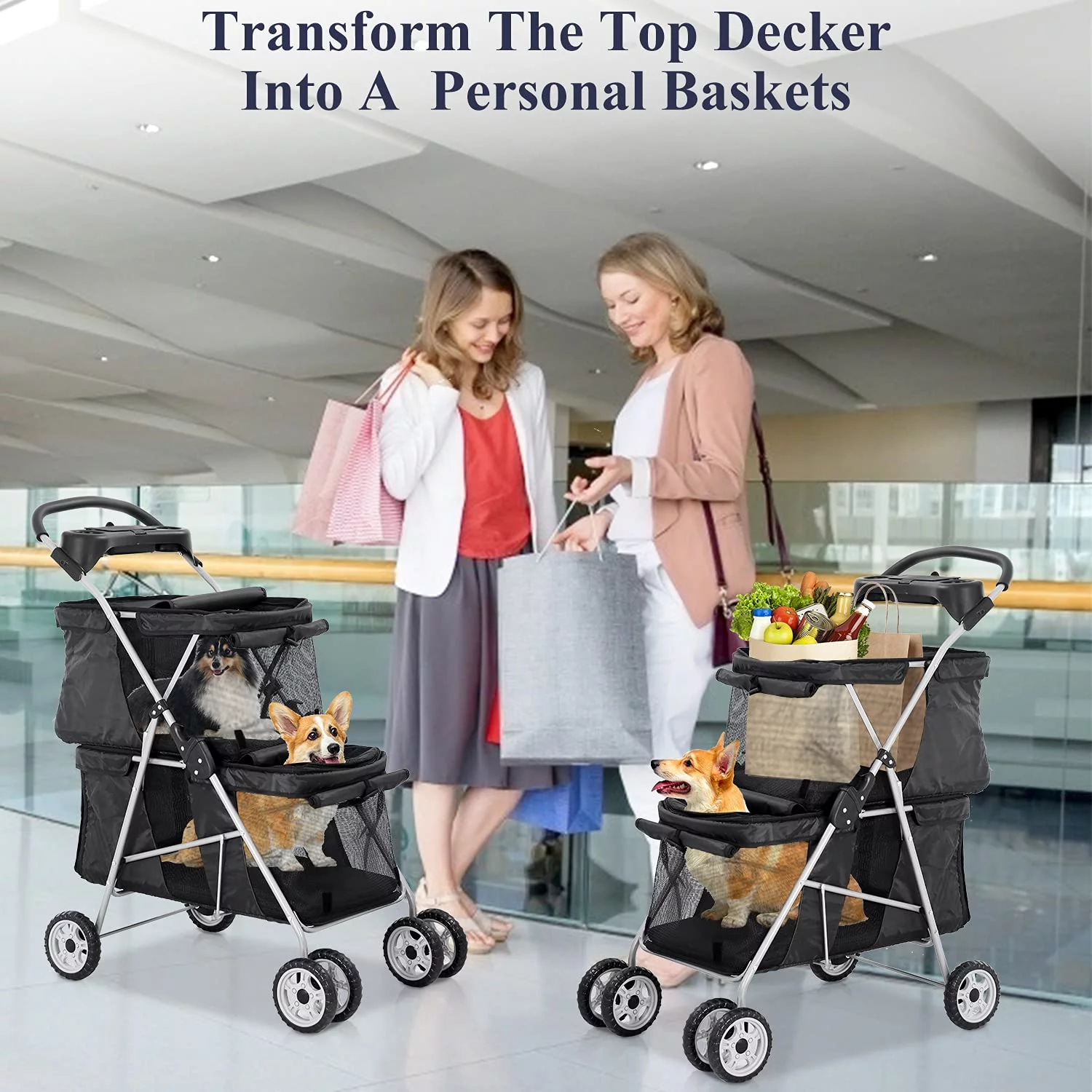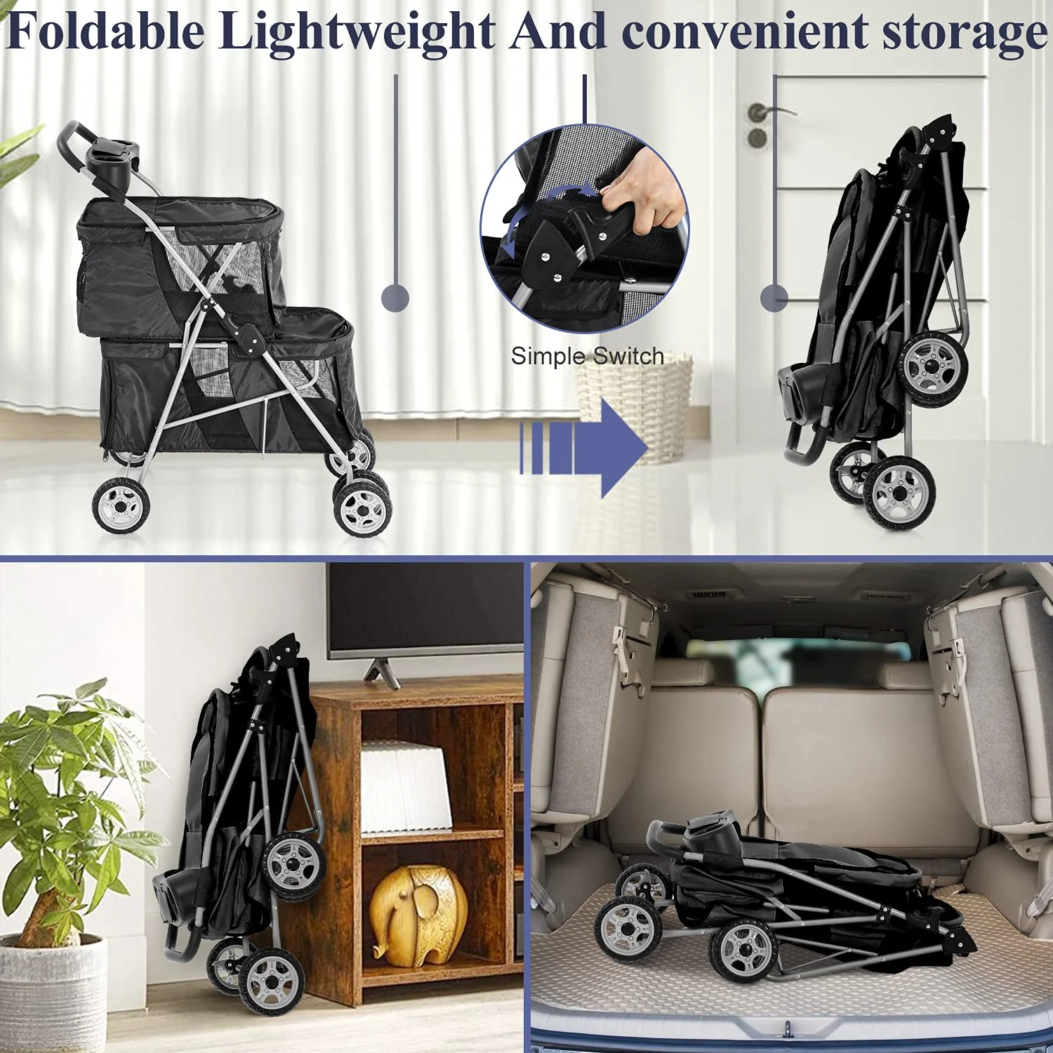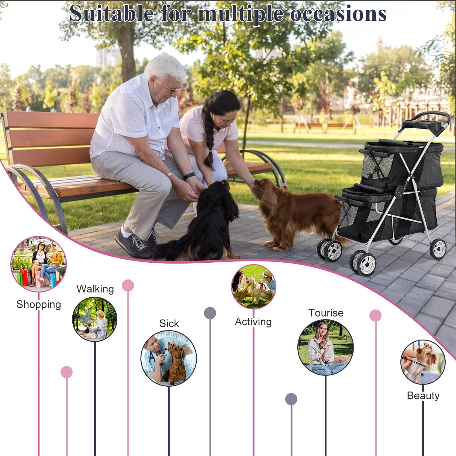 ??????Robust and Well Made??Our pet stroller is made of high quality Oxford cloth as well as a sturdy frame that can withstand the use of any animal up to 25 lbs, is waterproof, scratch-proof and anti-scratch. The tear-resistant breathable mesh windows provide a wide view of your pet while also ensuring air circulation and preventing insects from entering.? Soft pad makes your pet fell more comfortable and it is easy to clean. ??????Convenient Design??Our dog stroller is equipped with a wonderful cup holder for water bottles, cell phones or dog toys and snacks.? As well as the smooth handle can save your physical strength, makes you easier and faster to push the dog stroller.? A little mesh pocket behind the bottom compartment can store the toy of your cats/dogs. ??????Durable & Convenient Wheels??Large 4 wheels of our cat/dog stroller glide easily over smooth or rough terrain.? ?The front wheels can be rotated 360?? without dead ends, and you can turn on the straight walk to achieve a full-featured mobile lifestyle.? So when you brake, you can stop the dog trolley with just one foot on the brake. It is convenient in preventing sluggish skidding and can keep your pet safe. ??????Suitable for Small Pets??You can use the cat stroller go to shopping /walking/ hiking/ tourism with your pet. When your pet get is sick, hurt or difficult in action, it??s very easy to take your little friend out or take a walk. The top mesh windows keeping a close eye on your pets can be easier. Each compartment of the pet stroller features zippered mesh screen windows for easy zip and go. ??????Easy to Assemble and Fold??The dog stroller is easy to setup in few minutes with the install manual. The dog stroller open easily and folds up quickly. You can put the cat / dogs stroller in the trunk of the car or the corner of your house, do not take up a lot of space. ??Features: PVC High Density Oxford Cloth>>Durable oxford fabric, breathable and sun-proof, scratch-resistant and durable. Two-cage Design>>This double pet stroller allows lovable small animals to pop their curious head via the top opening.? Its top compartment can be converted into an extra basket. Flexible Joints>>Our dog stroller no tools required.? Once you??re done, the pet stroller quickly collapses for convenient storage. Waterproof Fabric>>Our pet stroller is made of high quality waterproof cloth, owners don’t have to worry about your pets got wet Suitable for small and medium pets >> Not occupying space, easy to maneuver through crowds. ??Specifications : Color: Black/Pink Material:Oxford cloth Item Weight: 14 Pounds? Overall Size: 30 x 20 x 40 Inches ;? ? ? ? ? ?? Two Cages’ Size: 20 x 14 x 12 Inches , 26 x 14 x 12 Inches (LxWxH)? Weight Capacity: 25 lbs
