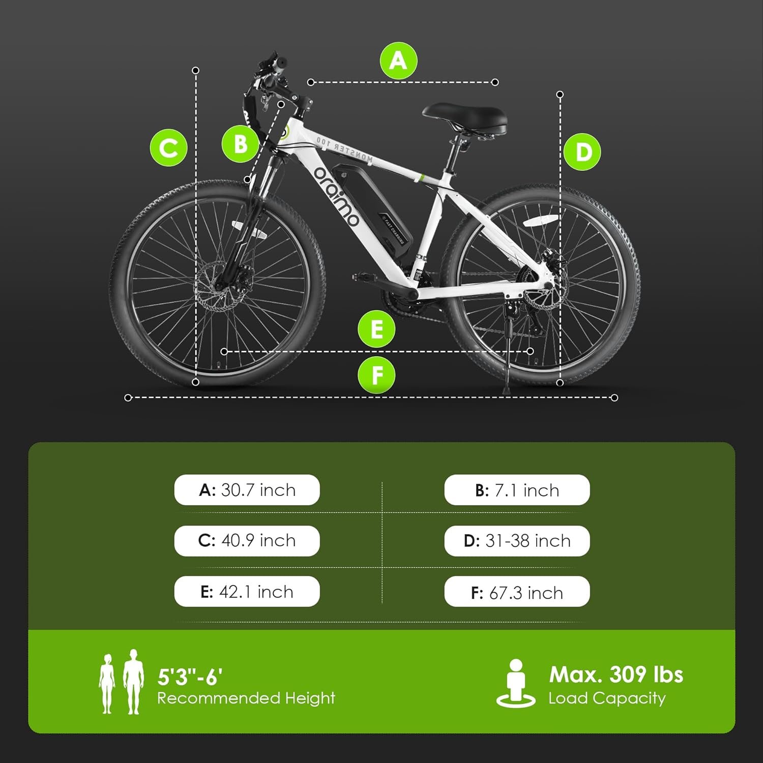 Bike Type Electric Mountain Bike Age Range (Description) Adult Brand Oraimo Number of Speeds 21 Color Black Wheel Size 26 Inches Frame Material Aluminum Suspension Type Front Special Feature UL Certified, Front & Rear Disc Brakes, 468Wh Lithium Battery, 350W Bafang Motor, 3H Fast Charging, Dual Front Fork Suspension Included Components Electric Bike, Charger Bike Type ?Electric Mountain Bike Age Range (Description) ?Adult Brand ?Oraimo Number of Speeds ?21 Color ?Black Wheel Size ?26 Inches Frame Material ?Aluminum Suspension Type ?Front Special Feature ?UL Certified, Front & Rear Disc Brakes, 468Wh Lithium Battery, 350W Bafang Motor, 3H Fast Charging, Dual Front Fork Suspension Included Components ?Electric Bike, Charger Size ?Large Brake Style ?Disc Item Weight ?49.6 Pounds Voltage ?36 Volts Style ?Freestyle Model Name ?Monster 100 Wattage ?350 watts Year ?2023 Maximum Weight Recommendation ?485 Pounds Assembly Required ?Yes Is Autographed ?No Rear Derailleur Clutch ?No Saddle Bag ?No Saddle Cushion ?No Chain Slap Protection ?No Saddle Cutout ?No Quick Release Seatpost ?No Quick Release Wheels ?No All Weather Tires ?No Regenerative Braking ?No Dropper Seatpost ?No Seatpost Suspension ?No Cargo Straps ?No Electric Assist ?Yes Lights Included ?No Chainguard ?No Has Reflectors ?No Is Tubeless Compatible ?No Is Cruiser ?No Has Coaster Brakes ?No Is Through Axle ?No Is 1x Drivetrain ?No Toe Clips ?No Frame Pump Compatibility ?No Shift Lever Reach Adjust ?No Is Tubeless Ready ?No Is Hub Drive Motor ?No Walk Assist ?No Item Package Dimensions L x W x H ?53.1 x 28.3 x 9.4 inches Package Weight ?63.9 Pounds Brand Name ?Oraimo Material ?Aluminum Suggested Users ?unisex-adult Manufacturer ?ORAIMO COMMUNICATION LIMITED Part Number ?Monster 100