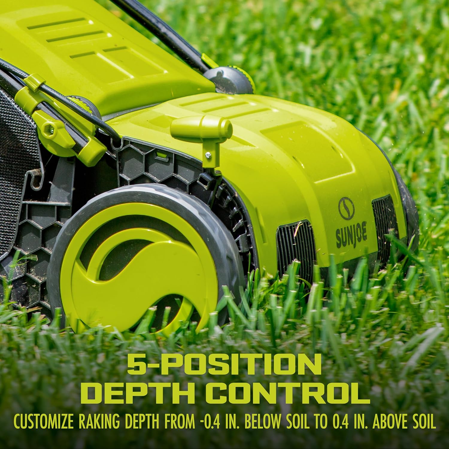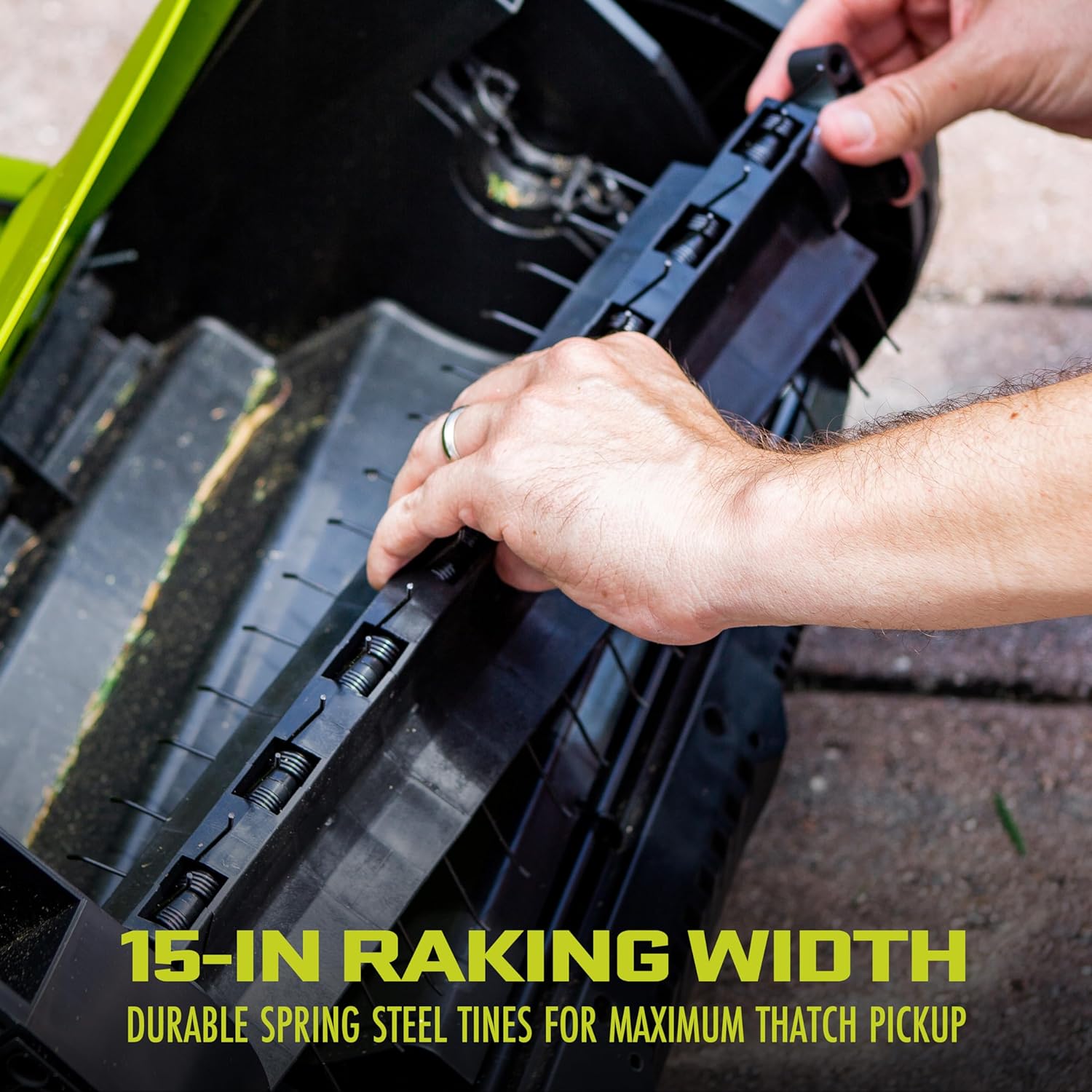AJ805E 15-Inch 13-Amp Electric Dethatcher and Scarifier w/Removeable 13.2-Gal Collection Bag, 5-Position Height Adjustment, Airboost Technology Increases Lawn Health, Green