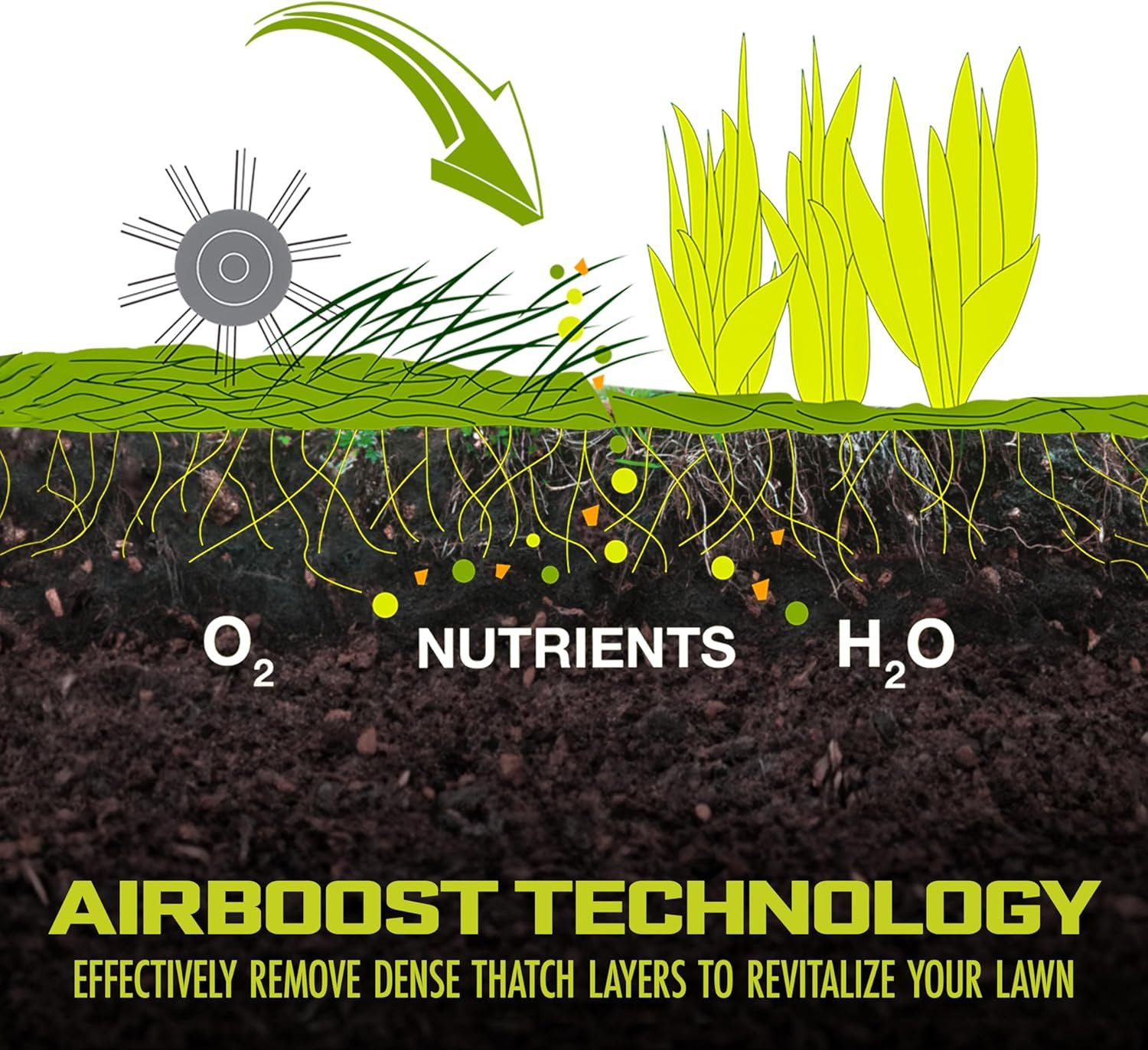 • [AIRBOOST TECHNOLOGY]: Spring steel tines for maximum thatch pickup