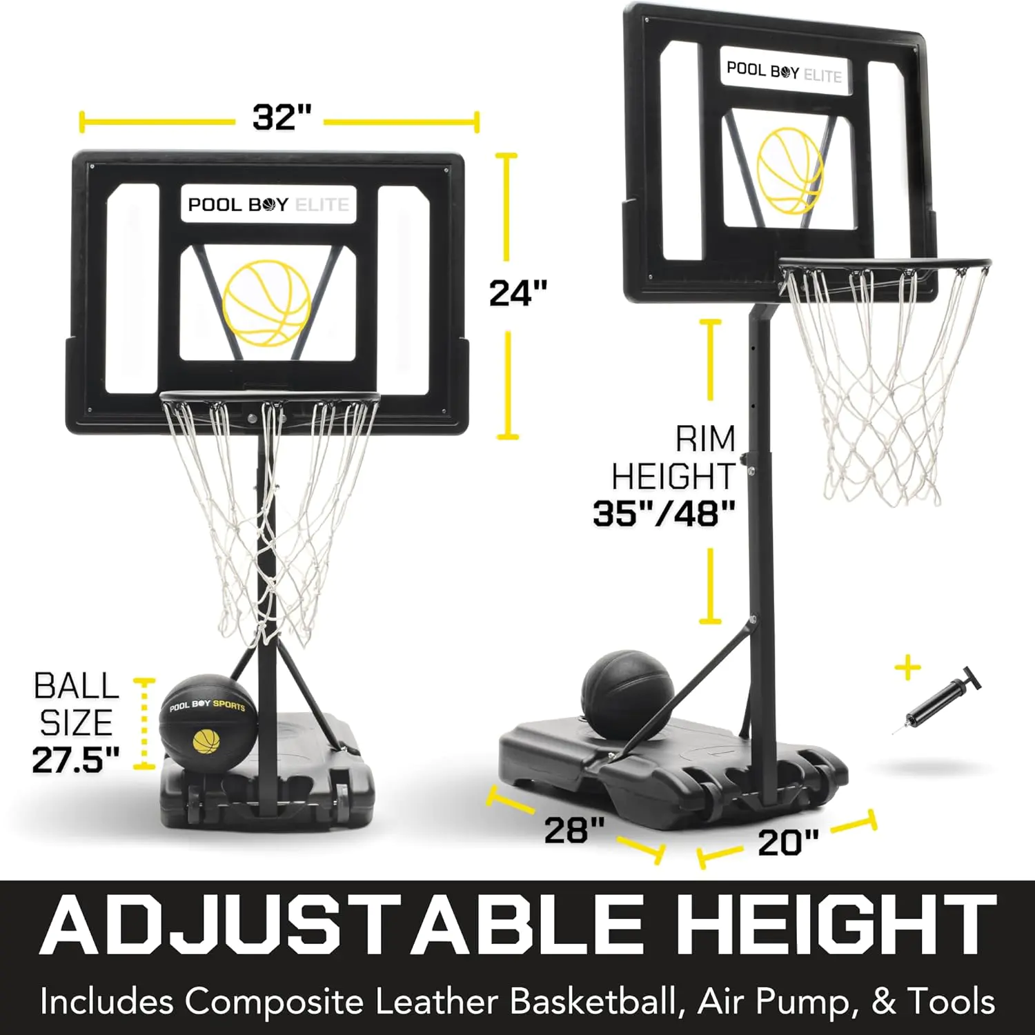 Includes: Pool Boy Elite Hoop, Composite Leather Basketball, Air Pump, & Tools