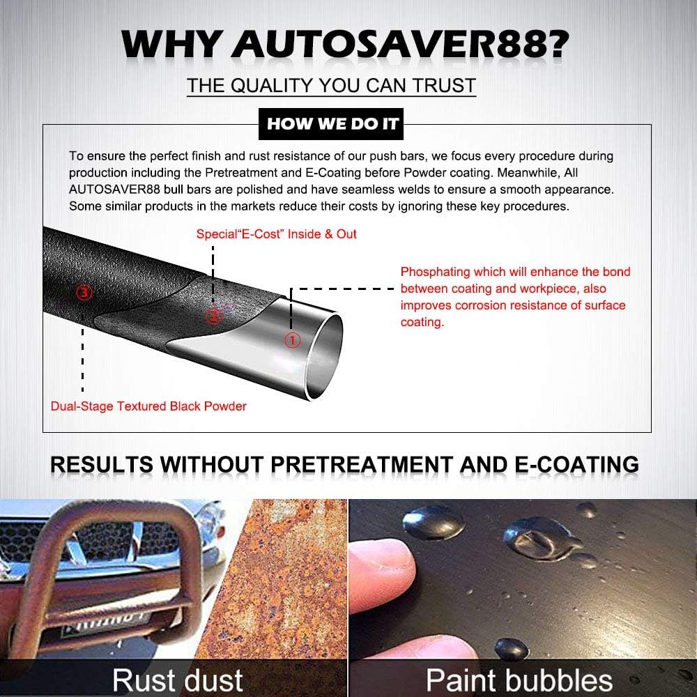 - Premium Finish: The push guard is made up of a 3″ heavy duty tubing frame that offers supreme durability and strength; e-coating and black powder coating are applied for rust resistance; Seamlessly welded for a smooth appearance