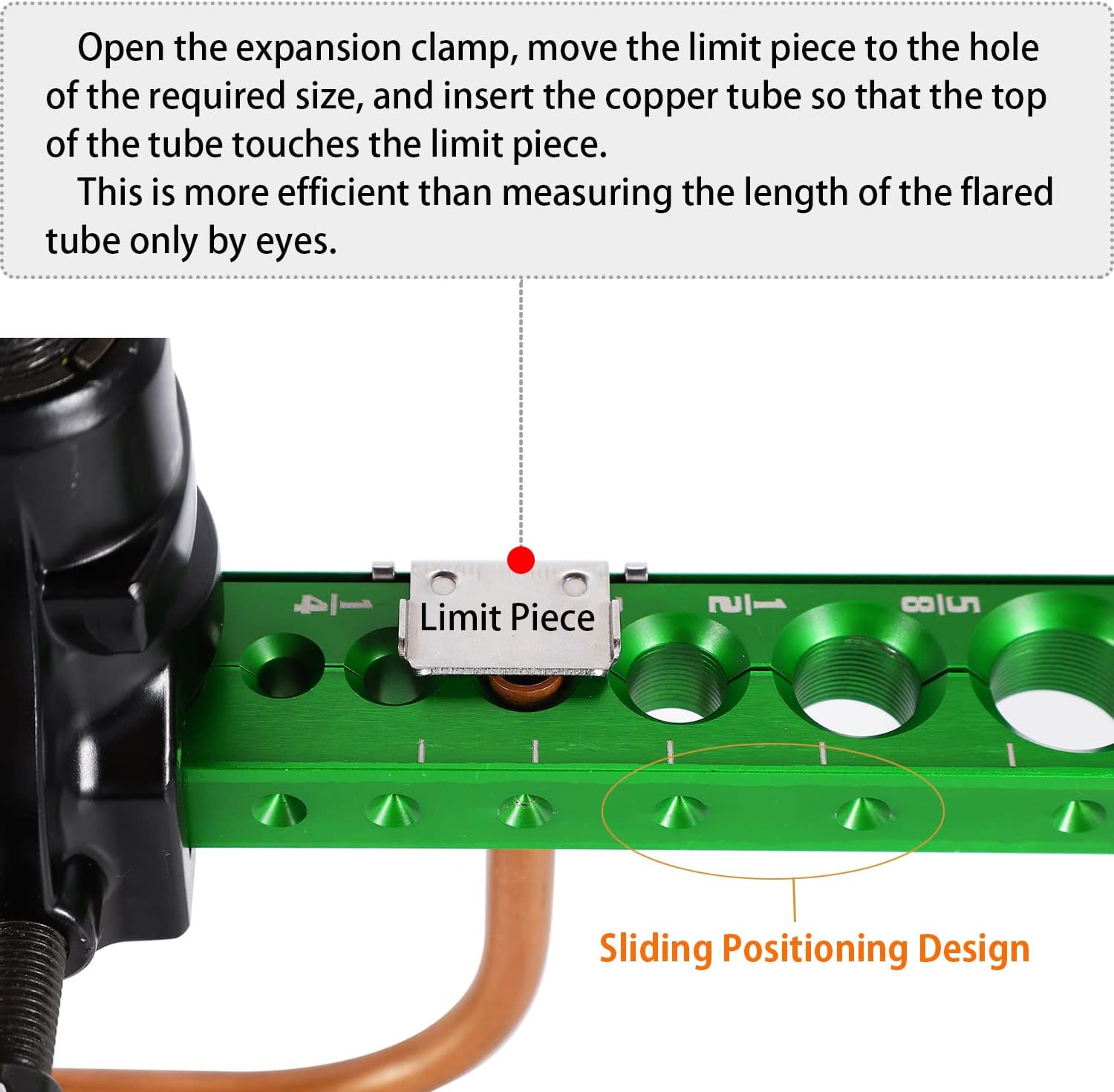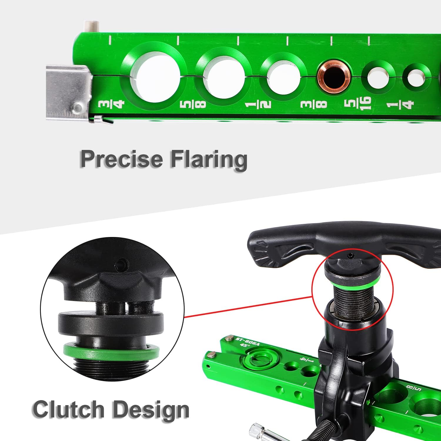 • [Limit Piece & Clutch] – (1)After inserting the copper tube, the length of the flared tube can be precisely limited by the limit piece, which is more efficient and convenient than measuring by eyes only. (2)There is a clutch in the rotating handle, which will automatically disconnect when the flaring operation is completed.