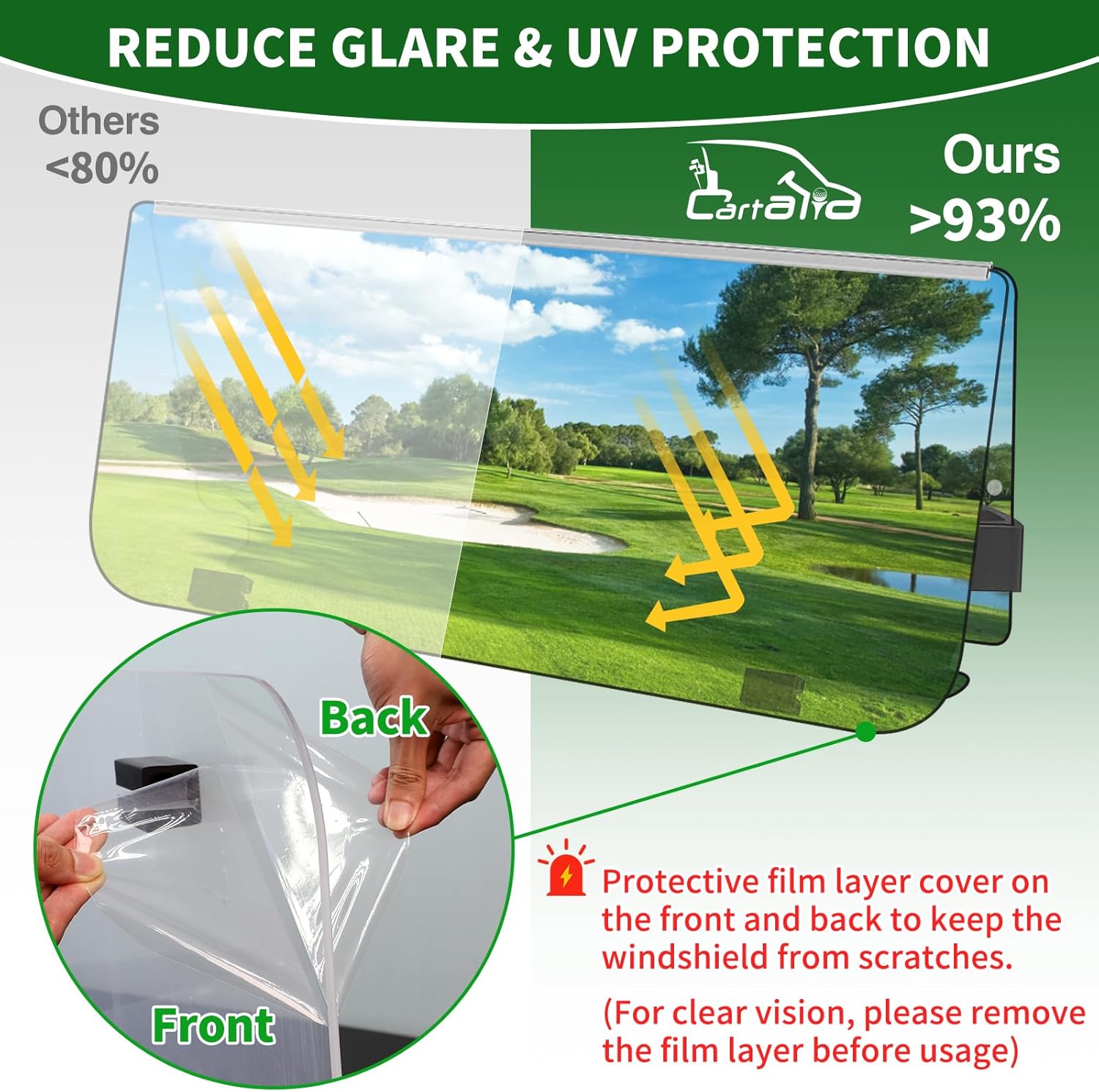 - Great Visibility In All Seasons: The ezgo windshield for golf cart is sophisticated made, features reduce glare and UV protection. It’s good for protecting passenger against windstorms, dust, twigs, ensure more driving outdoors safety when under changing weather.
