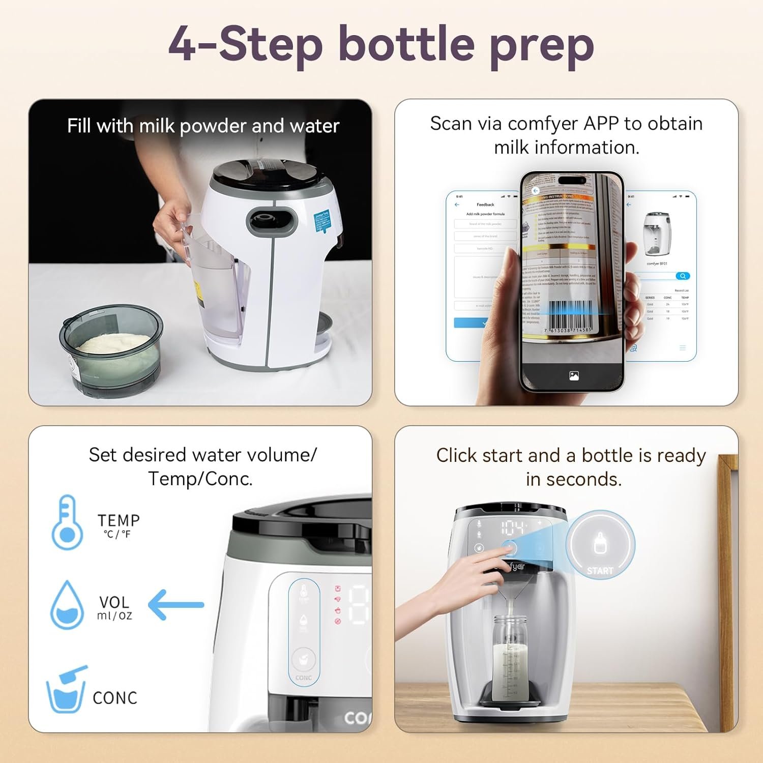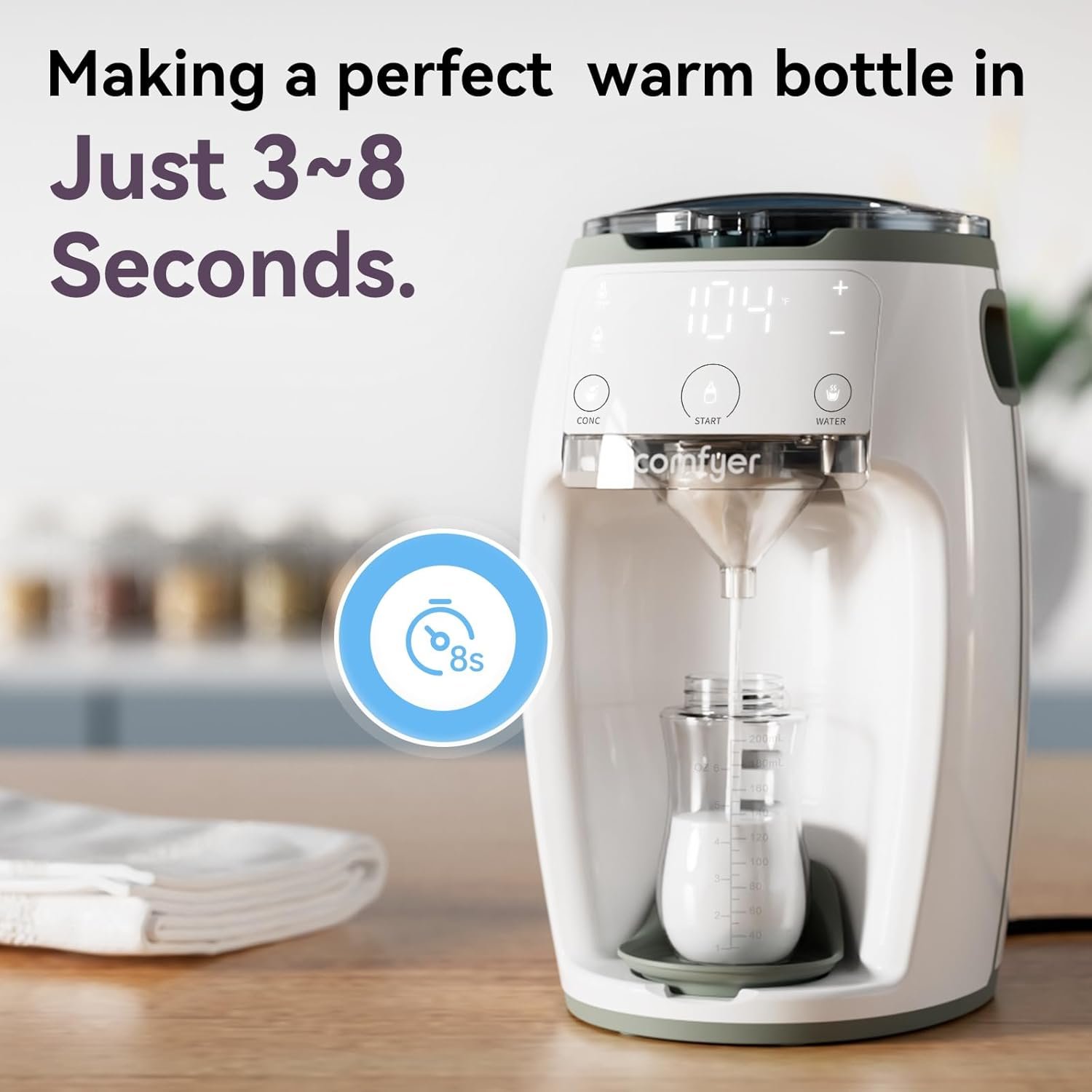 - ??MAKING A PERFECT BOTTLE IN 3-8 SECONDS??comfyer baby formula maker helps faster and more timely feeding and soothing little ones, giving moms peace of mind. Innovative Mixing tech ensure accurate concentration, effectively avoiding bubbles and formula powder clumping, preventing discomfort in babies. Instant water heating tech provides fresh hot water for ready-to-use, more healthier. comfyer electric formula dispenser machine prepares a warm bottle in 8 seconds! Food-grade approved, BPA free.