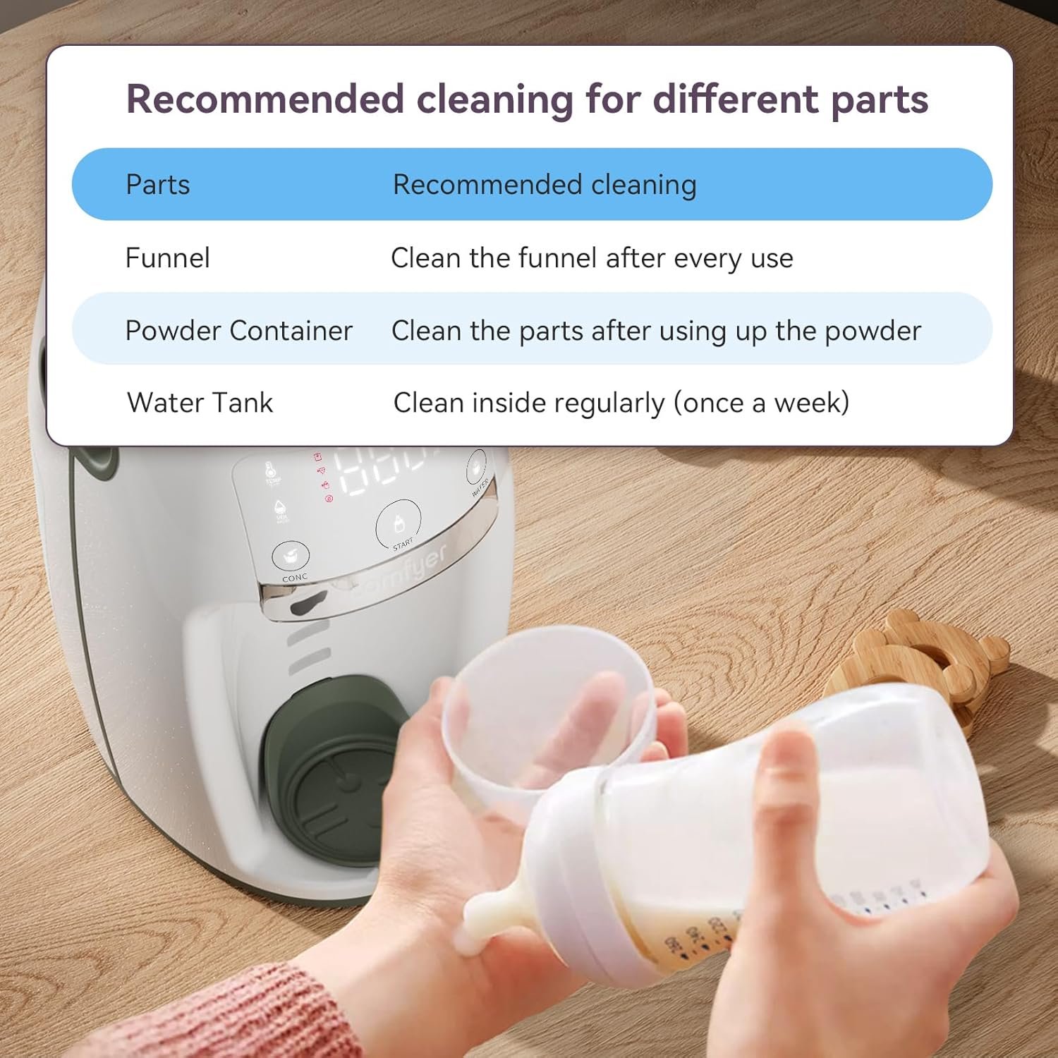 - ??CLEANING GUIDE??To ensure babies drinking safely and maintain hygienic of key milk-prep parts, please clean the funnel after each use; powder nozzle once a day (refills parts B0CGL54GX3 can be purchased separately); Water tank and milk powder cannister can be cleaned in water below 104??F to avoid deformation.
