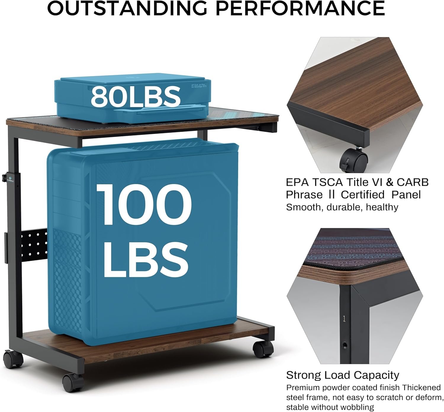 - Sturdy Structure: EPA TSCA Title VI & CARB Phrase ?? Certified desktop panel with premium anti-scratch finish. Thickened steel frame with powder-coated finish resists corruption to ensure stability and durability, not easy to scratch or deform, no wobbling. The bottom shelf max weight up to 100LBS, top shelf is 80 LBS. NOTE: When moving, the computer tower stand can only supports up to 80 LBS