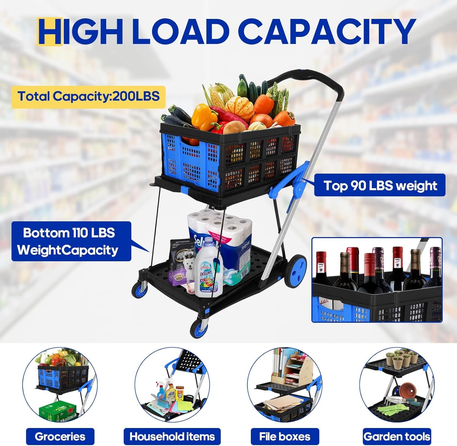 - MULTIFUNCTIONAL USES — The Multi-functional Foldable Cart can works in any scenario,change its modes as you need.folding the top layer to Load buckets in garden,or using 2 baskets for groceries in supermarket.It`s easier to transport large and heavy items, suitable for use in garage, shopping, dining,toolshop and the food industry