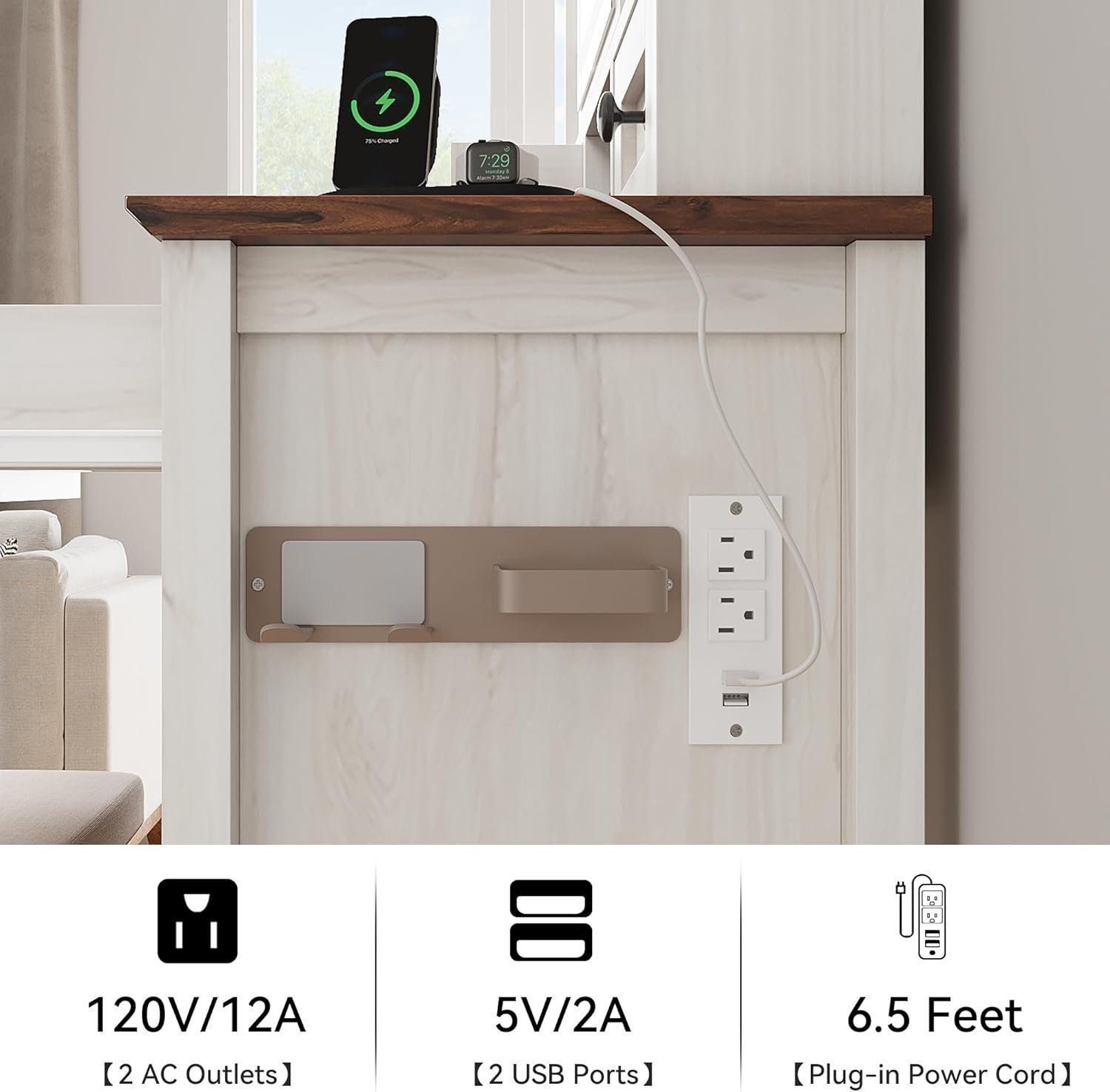 Charging Station & Hair Dryer Rack: Featuring a convenient charging hub for effortless device charging and a dedicated hair dryer rack for convenient hair dryer placement, our farmhouse vanity desk is designed to enhance your daily routine with ease and organization