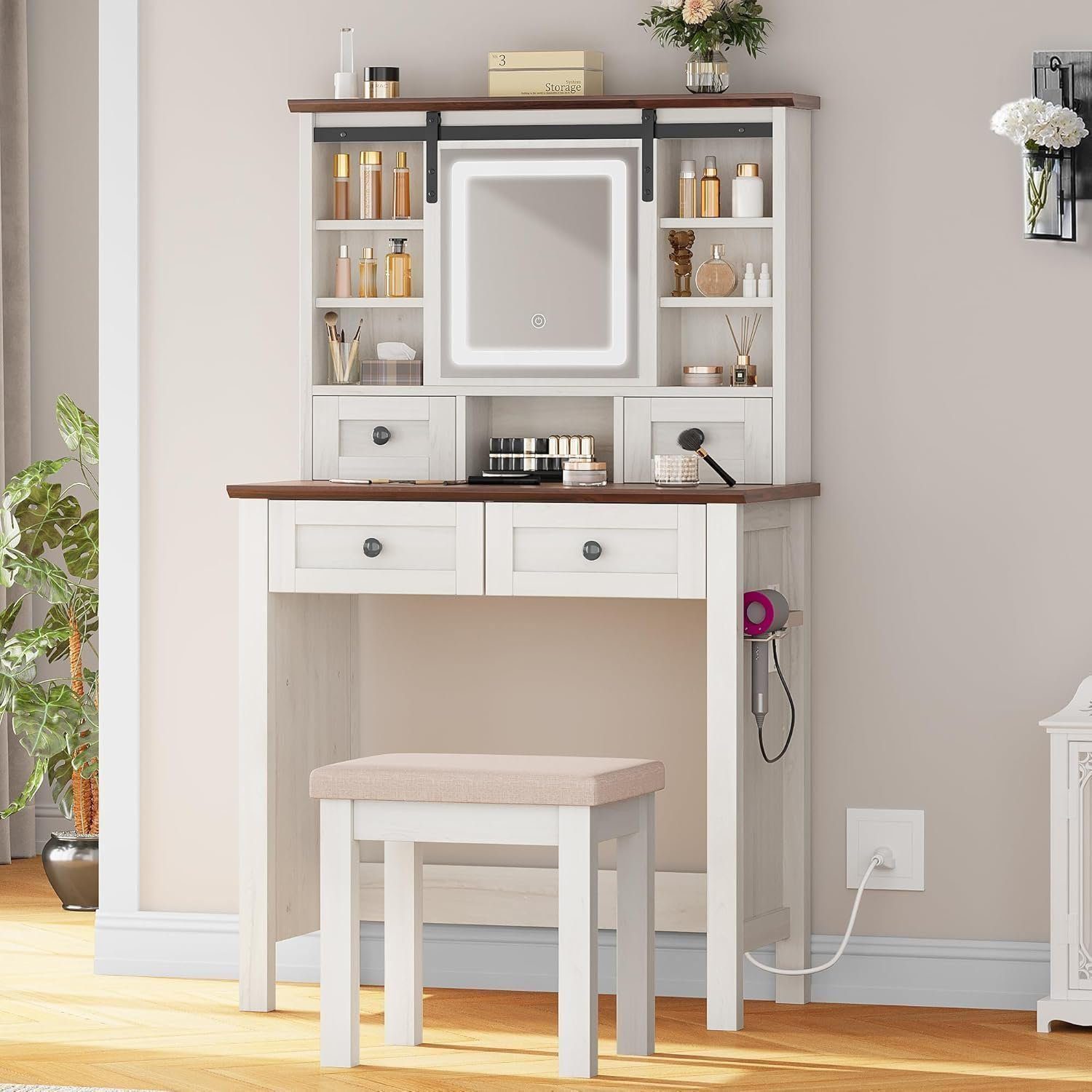 Rustic Farmhouse Elegance: Embrace rustic farmhouse elegance with our chic makeup vanity desk, where the wooden tabletop seamlessly combines farmhouse charm with sophistication with an antique two-tone design in elegant white; It includes a sliding lighted mirror and a plush stool, radiating allure and elegance in every detail