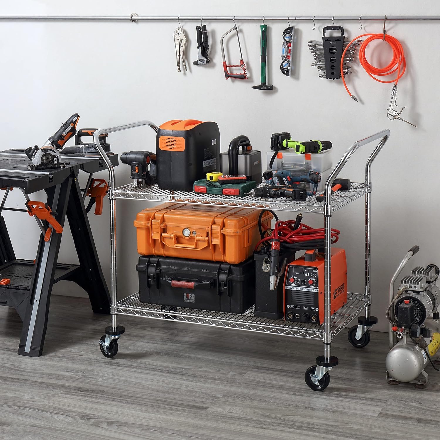 - MUTI-FUNCTIONAL – 2 Shelves unit on 4 inches industrial wheels (2 with brake) to hold and move many large appliances. Double Side Handles to help you easy move during using. Ideal for using in kitchens, warehouses, garages, offices and restaurants, simplified the transporting of heavy and bulky loads.