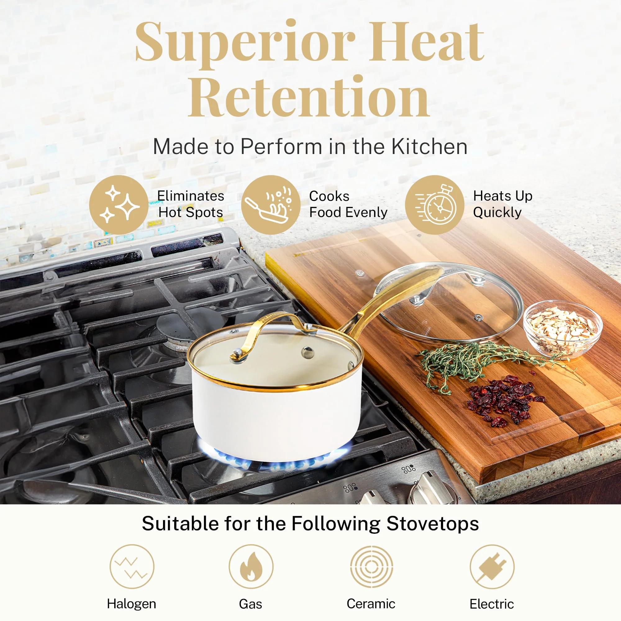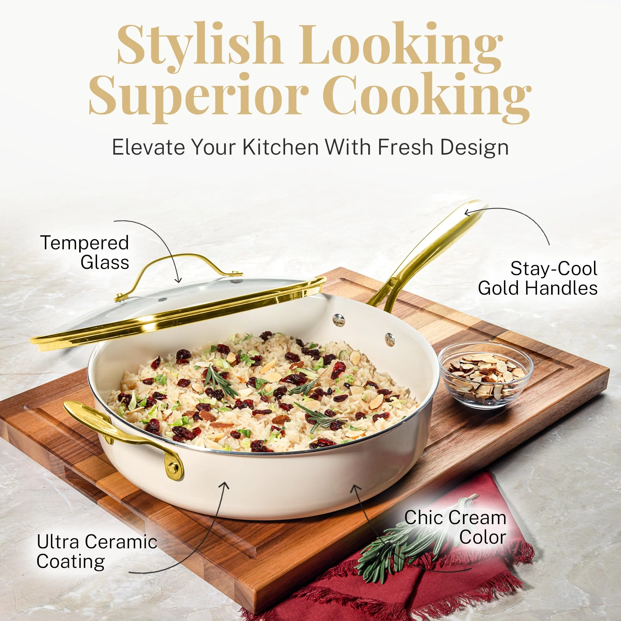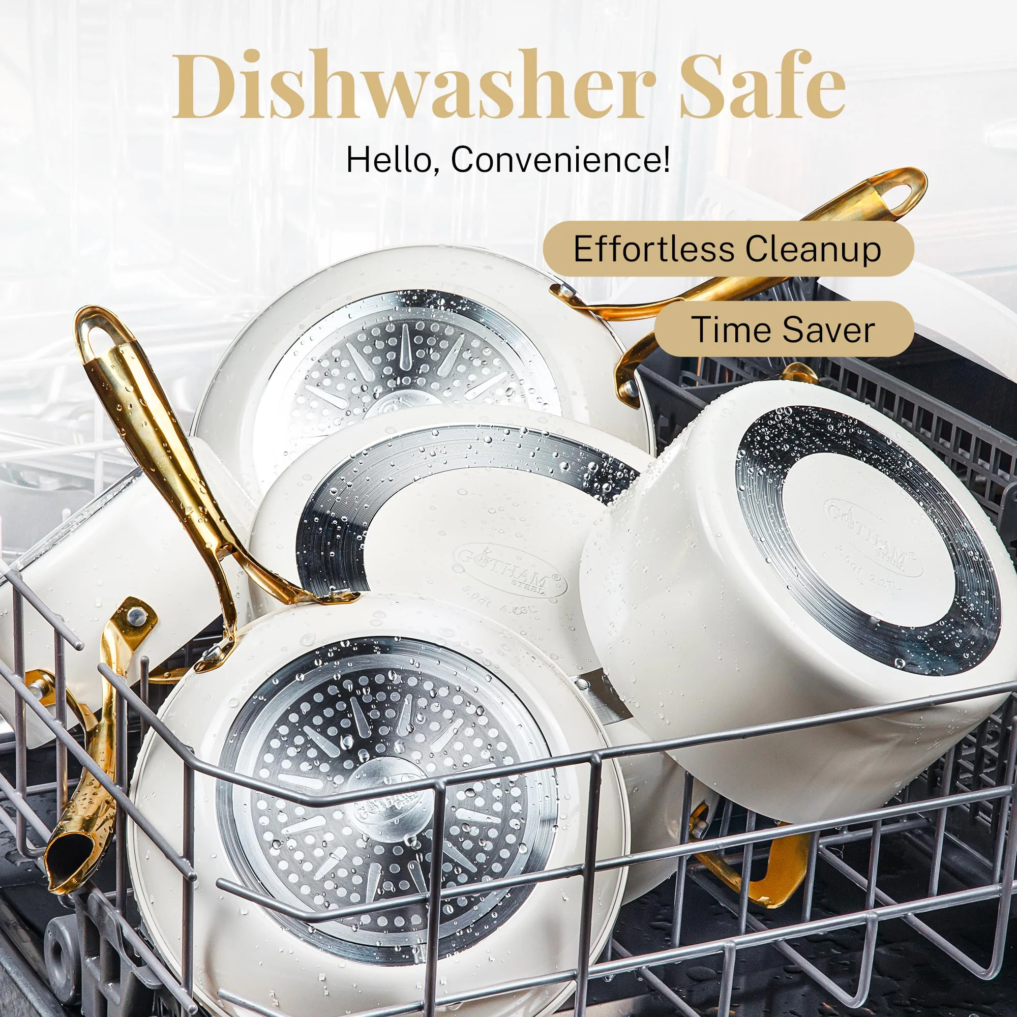 GOTHAM STEEL NATURAL COLLECTION: Healthier cooking is easy with this nonstick ceramic cookware set. Pots and pans are designed to be 2x more durable, dishwasher safe, and oven safe up to 500?F. Gold stay-cool handles allow you to go from stovetop to oven. But this set doesn??t just cook good, they look good too, with a modern cream color that adds an elevated aesthetic to your kitchen. 15 PIECE KITCHEN COOKWARE SET: This set includes everything you need to outfit a kitchen including an 8.5 Inch frying pan, 10.25 inch frying pan with lid, 1.5Qt saucepan with lid, 2.5Qt saucepan with lid, 5Qt stockpot with lid and steamer, 5 Pc nylon kitchen utensils set. ULTRA NONSTICK CERAMIC SURFACE: Healthy cooking is just a step away. Thanks to a nonstick surface that??s 2x more durable than previous generations, minimal to no oil or butter is needed. And they??re designed to properly conduct heat so food cooks evenly. NON-TOXIC COATING: All pots and pans made without PFOA, PFOS, PFAS, PFTE, lead, or cadmium, so they??re safer for you and your family. EASY TO CLEAN: No more stuck-on bits! Food slides right off when used on low and medium heat as directed. Wipe off with minimal scrubbing. The ceramic coating is stain resistant (and scratch resistant) so no need to worry about tomato sauce, beets, or any other food. Plus this set is designed to be dishwasher safe. DISHWASHER SAFE: Spend less time on cleanup during busy weeknights. Once you??re done cooking, just place your cookware into the dishwasher for a hassle-free cleaning experience. EASY TO HANDLE: Easy to lift and move around, from stovetop to oven to table, yet sturdy enough to handle all your cooking needs. Ergonomic handles stay cool to the touch to offer maximum comfort while cooking. OVEN SAFE TO 500?F: Go from stovetop to table with ease. All pieces are compatible with gas, electric, ceramic, and halogen stovetops. Plus, fry pans and saucepans are compatible with induction ovens, while stock pot is not. GREAT GIFT: Give a practical and thoughtful present: college grads, a wedding shower, newlywed registry, housewarming for new renters and homeowners, or someone who really enjoys cooking with well-made cookware. Or stock a vacation rental with picture-worthy cookware. 10-YEAR PROMISE: Guaranteed to last for up to 10 years. Product information Material Ceramic Nonstick Color Cream White and Gold Brand GOTHAM STEEL Size 15 Piece Handle Material Stainless Steel Is Dishwasher Safe Yes Material Type Free PFOA FREE, PFOS FREE, Lead Free, CADMUM FREE Compatibility Options Stovetop Compatible Closure Material Tempered Glass Included Components 2.5 Qt Saucepan with Lid, 1.5 Qt Saucepan with Lid, 5 Qt Stock Pot with Lid, 10.25 Inch Frying Pan with Lid, 8.5 Inch Frying Pan Is Oven Safe Yes Product Dimensions 23.81 x 13.97 x 9 inches Item Weight 13.2 pounds