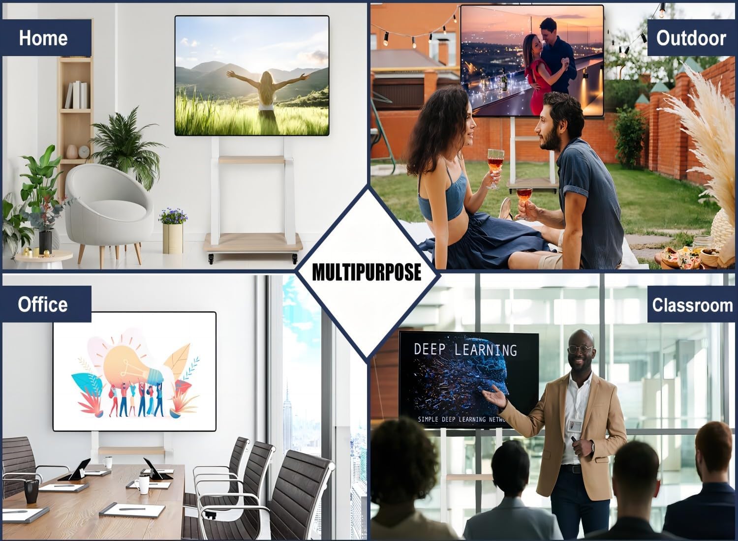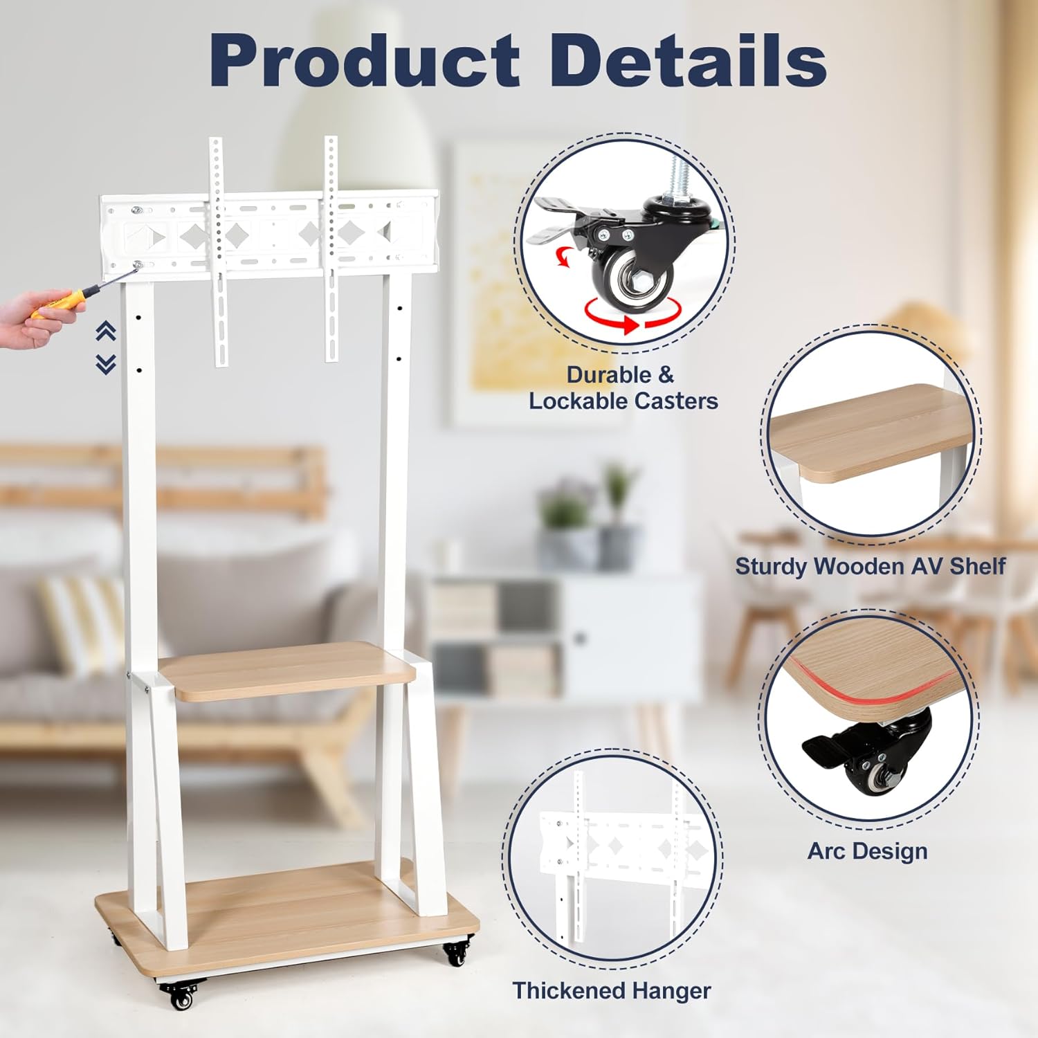 - ??Sturdy and Stable??Our heavy duty rolling TV stand is made with a stable frame and solid metal construction. And the outdoor tv stand on wheels can easily support 220 pounds of weight.The base features high-strength one-piece support rod design,ensuring solid and stable support,especially suitable for heavy-duty conference equipment. The combination of the white metal support pole and the wood grain texture design of the base not only enhances the stylish appearance but also adds a touch of texture to the overall stand