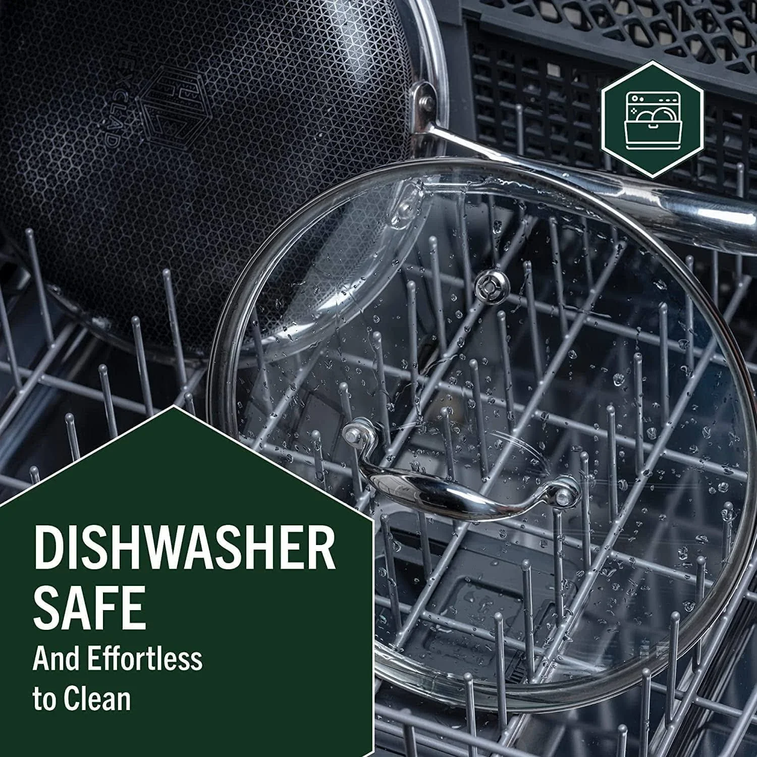 Patented hybrid tech utilizes tri-ply construction ?C aluminum between two layers of stainless-steel – laser-etched with our hexagonal nonstick surface to deliver the searing power of stainless, durability of cast-iron and easy cleanup of nonstick. A size for all cooking occasions, our Hybrid 8-inch, 10-inch and 12-inch pans offer the ultimate in versatility in cooking when it comes to frying, saut??ing, and simmering. Use your HexClad cookware on any home cooktop or stovetop, including induction. Every piece is also scratch-resistant, dishwasher-safe, and oven-safe up to 500??F. (Lids are oven-safe up to 400??F.) (Commercial and restaurant use excluded). Our HexClad design is built with the highest quality materials and designed to last a lifetime. HexClad utilizes a tri-ply or clad style pan. This way it not only works on gas and electric stoves but also on newer magnetic induction cooktops. This unique design creates a series of peaks and valleys.