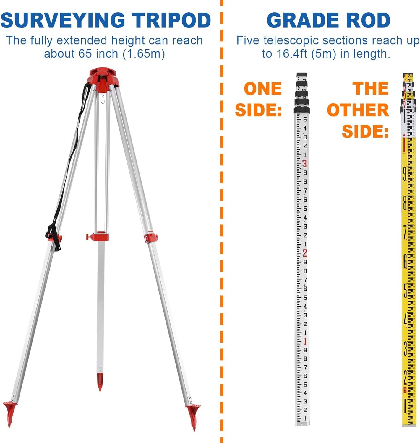 - ??Rotary Laser Level Kit?? This rotary laser system kit includes the self-leveling rotary laser, surveying tripod and aluminum grade rod. Surveying tripod with extendable legs, the fully extended height can reach about 65 inch (1.65m); Adjustable aluminum grade rod, five telescopic sections reach up to 16.4ft (5meter) in length.
