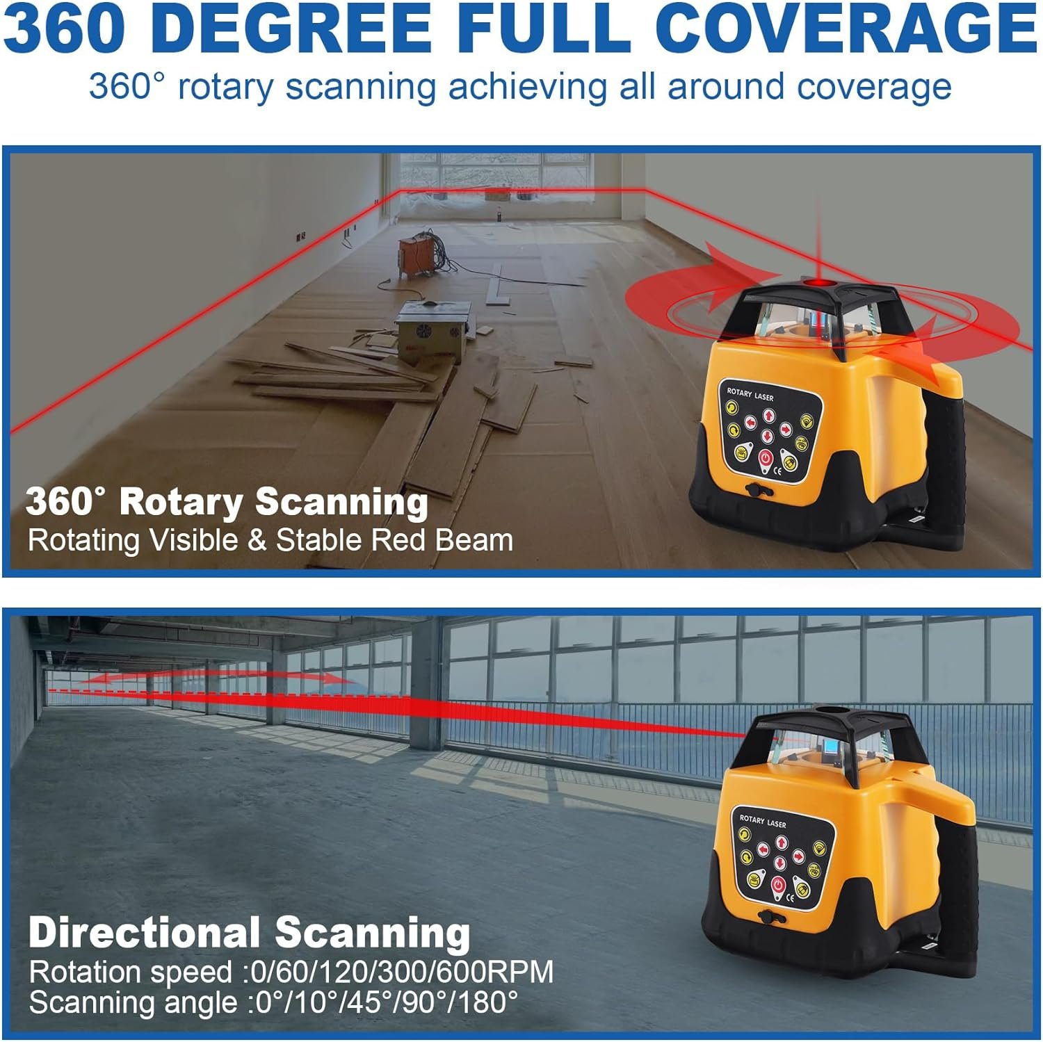 - ??Automatic Alignment and Adjustable Speed?? This self-leveling rotary laser level can align automatically. In self-leveling mode, when the laser exceeds the self-leveling range (??5??), the line laser level beeps and the beam flashes quickly. The scanning speed can be adjusted at 0, 60, 120, 300 and 600rpm. For both vertical and horizontal use.