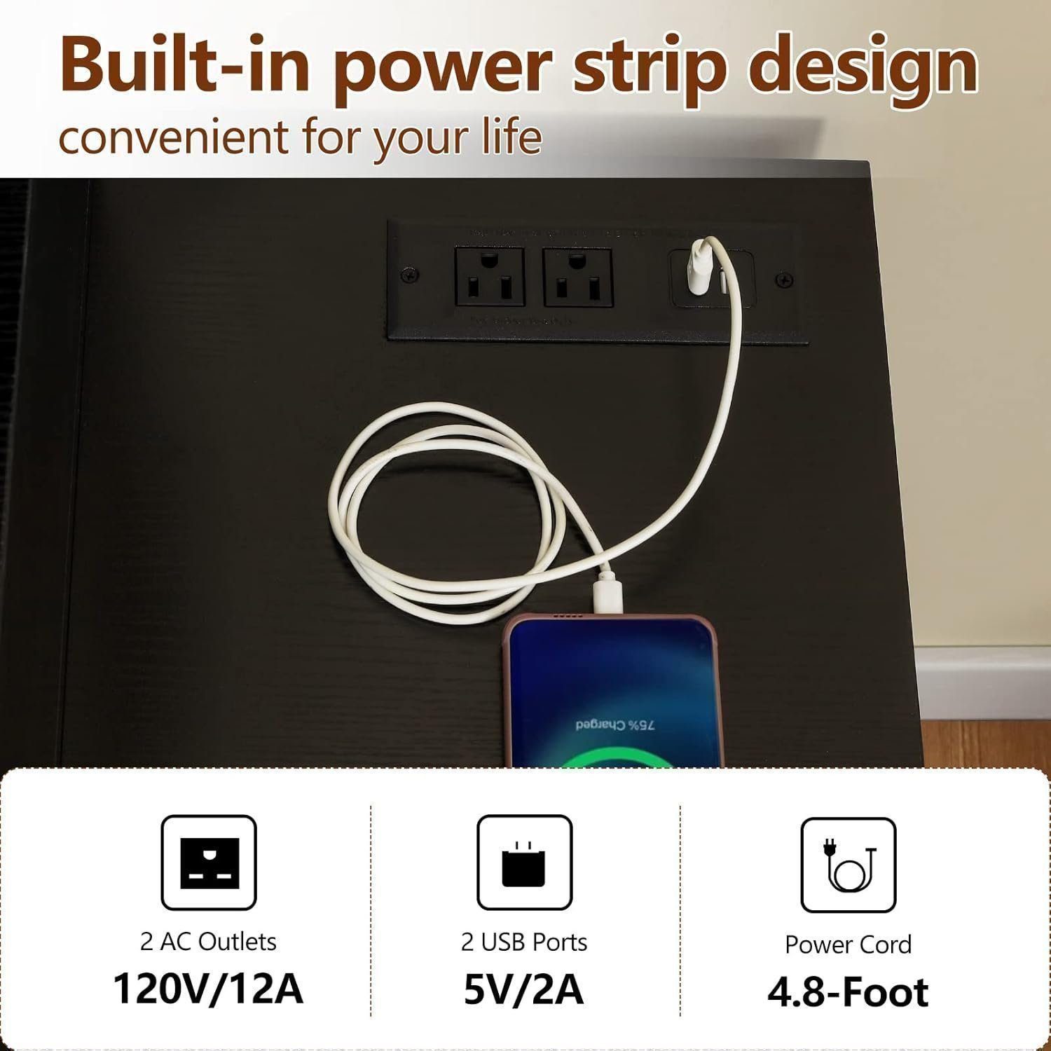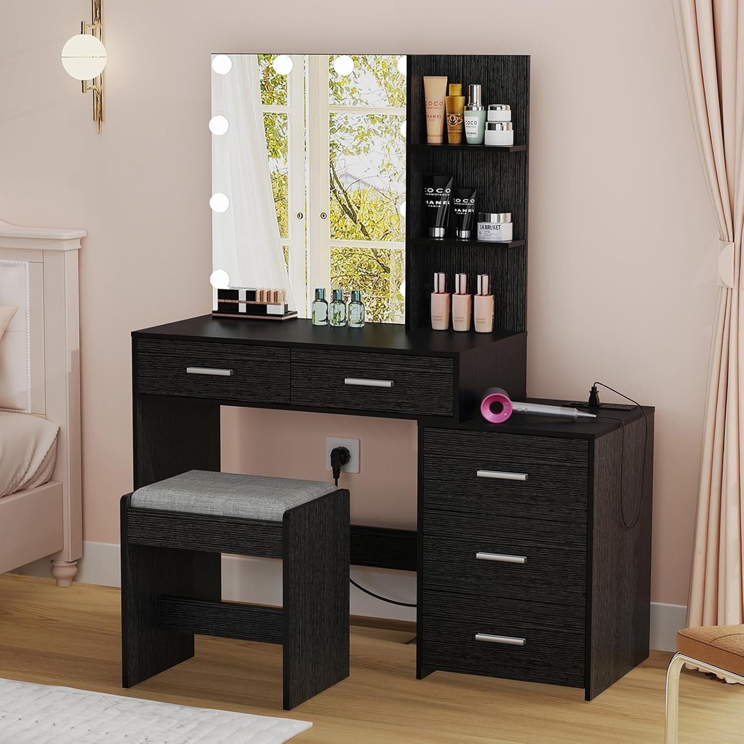 Vanity Set with USB Ports & Outlets: No more searching for power strip! USIKEY vanity table equipped a built-in power strip, includes 2 standard plug sockets and 2 USB ports provide great convenience for you to use hair dryer and curler, Without moving your position, you can finish your exquisite makeup and hair styling in front of the dressing table!