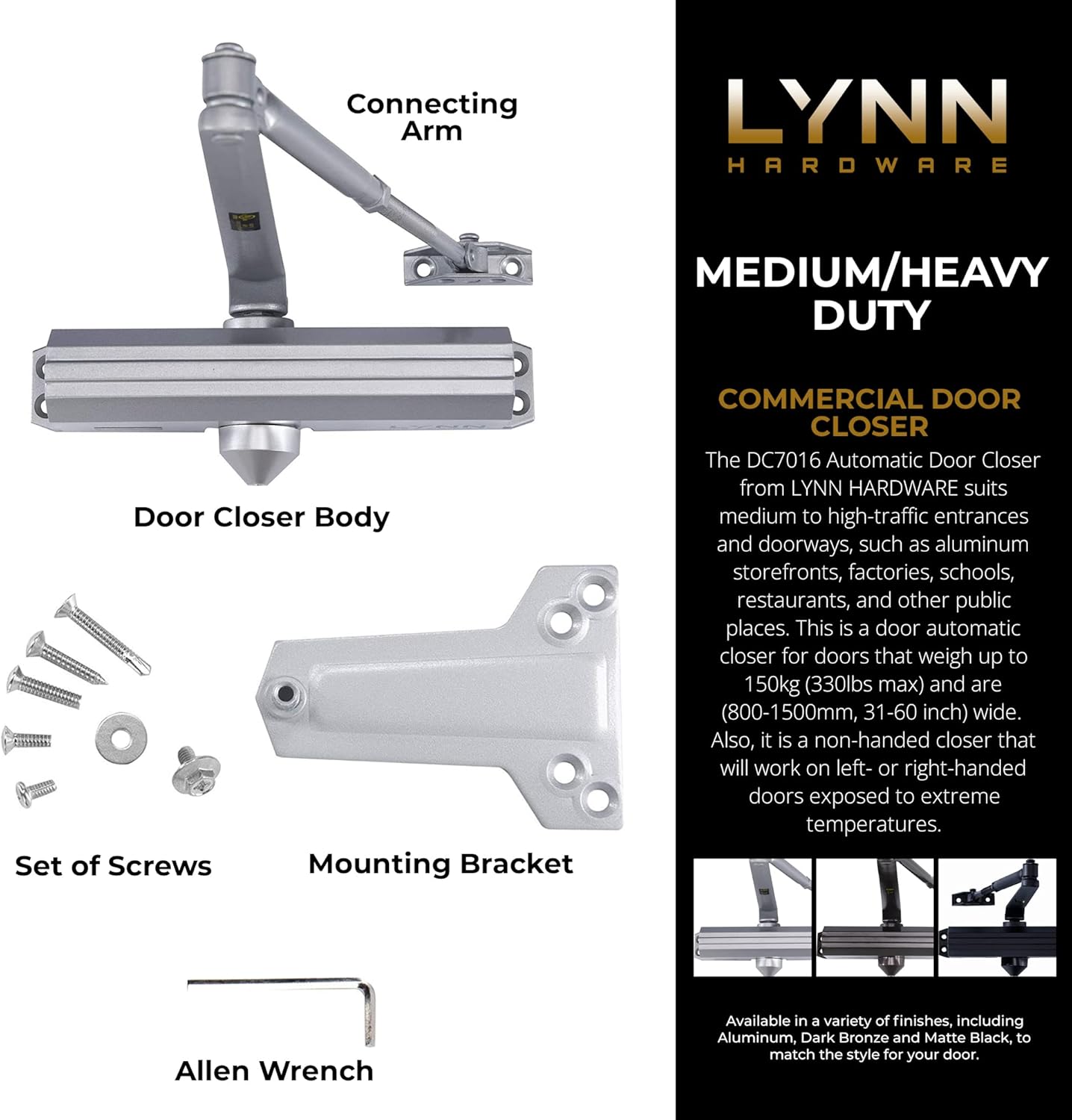 • DOOR CLOSERS COMMERCIAL USAGE: The DC7016 Automatic Door Closer from LYNN HARDWARE suits high-traffic entrances, such as aluminum storefronts, factories, schools, restaurants, and other public places. This is a door automatic closer for doors that weigh up to 150kg (330lbs max) and are (800-1500mm, 31-60 inch) wide. Also, it is a non-handed closer that will work on left- or right-handed doors exposed to extreme temperatures.