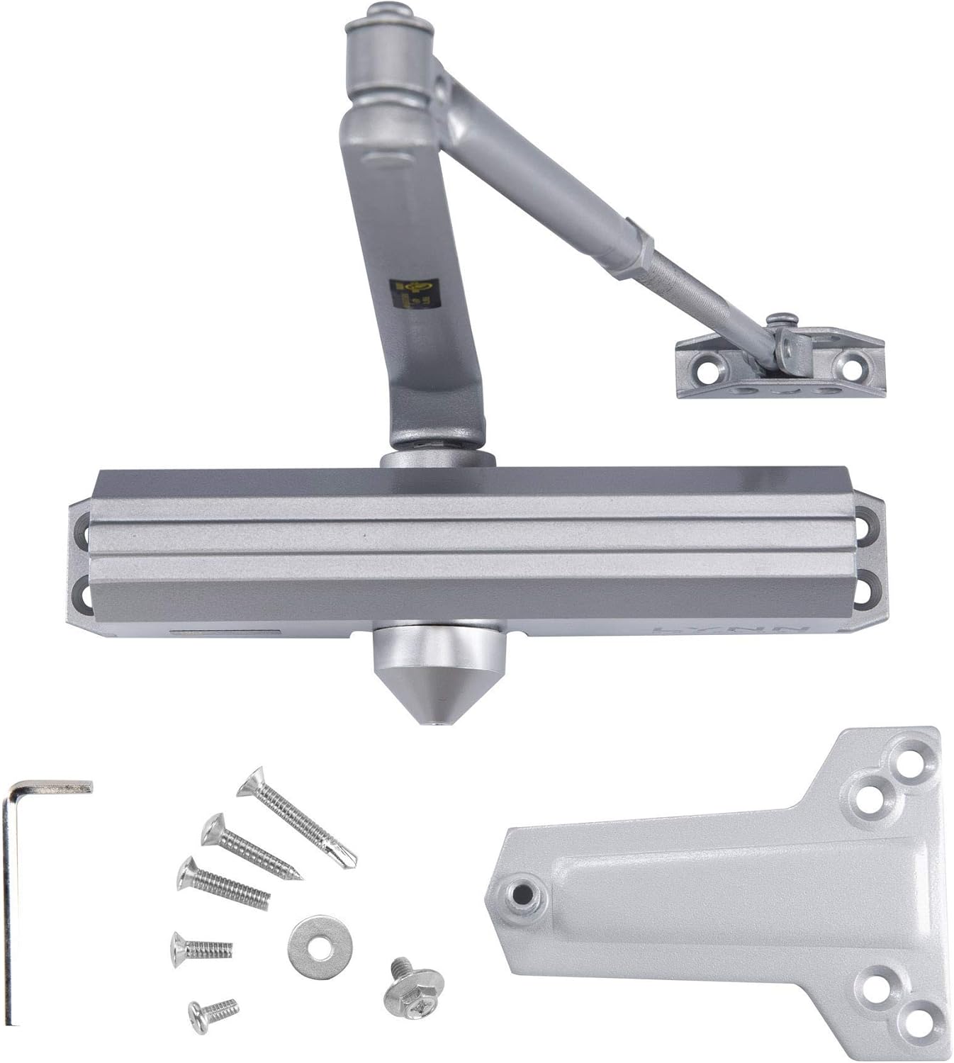 • MATERIAL: It is Grade 1- ADA & UL 3 Hour Fire Rated, Surface Mounted and crafted from durable Aluminum. This closer is adjustable from size 1-6 and has a precise cast aluminum body, forged steel arm and heat treated piston that can support doors weighing up to 330 lbs. Offers superior protection against harsh weather conditions and corrosion because it has Powder Coated Finished Body with brackets and Soffit Plate to allow Regular-Top Jamb-Parallel Arm.