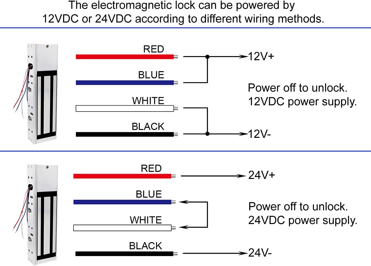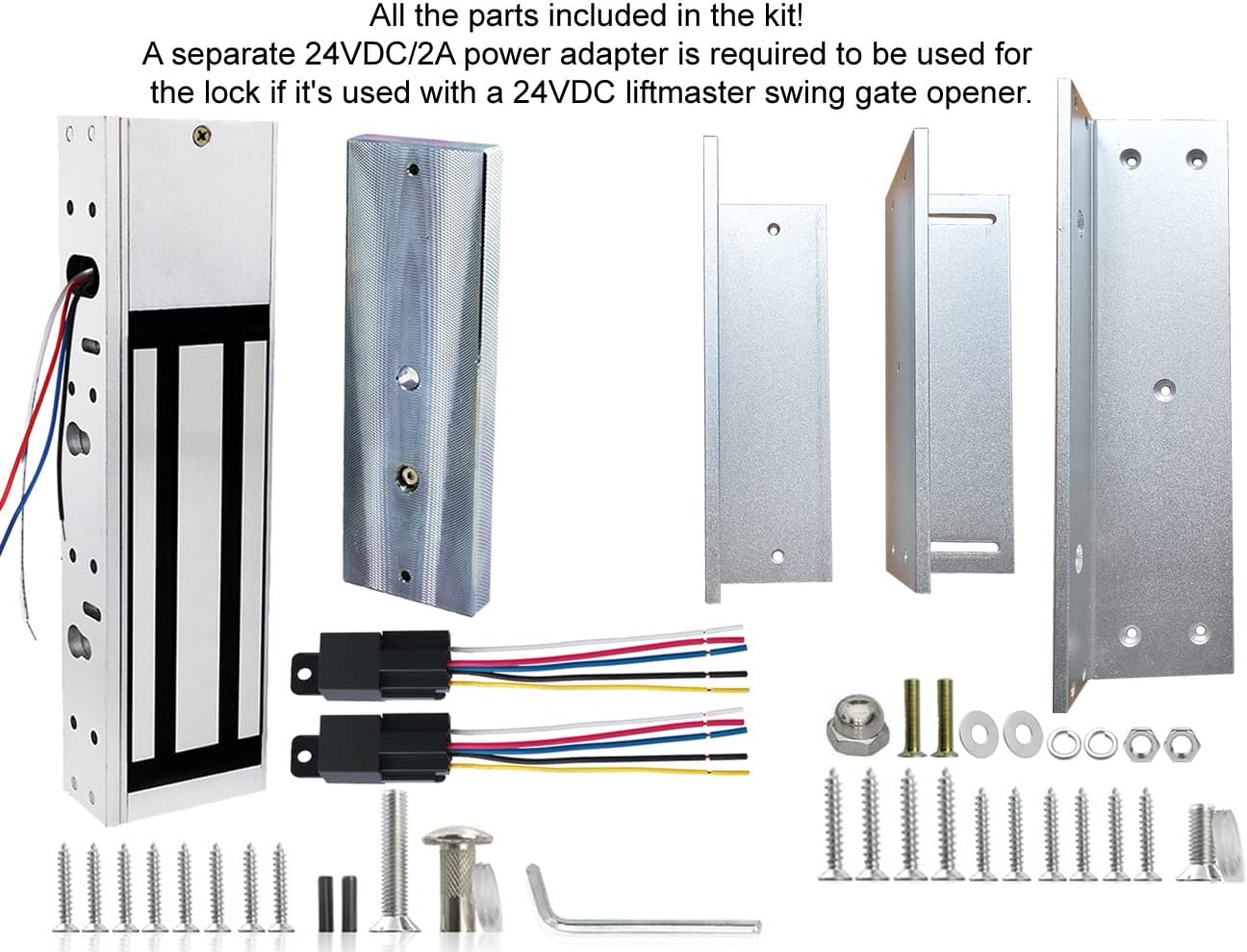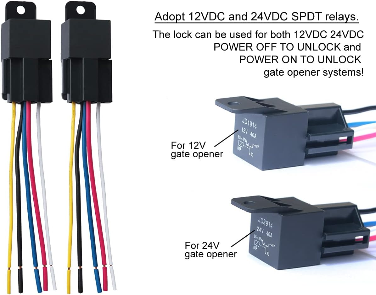 - SUPPORT BOTH 12VDC and 24VDC POWER SUPPLY – The lock can be powered by 12VDC or 24VDC according to different wiring! A separate 24VDC/2A power adapter is required to be used for the lock if it’s used with a Liftmaster 24VDC gate opener!