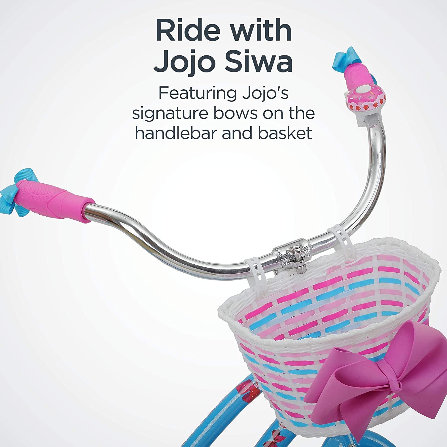This kids’ bike with 20-inch wheels comes ready to be assembled and includes authentic Jojo Siwa graphics. handlebar basket. and bows.