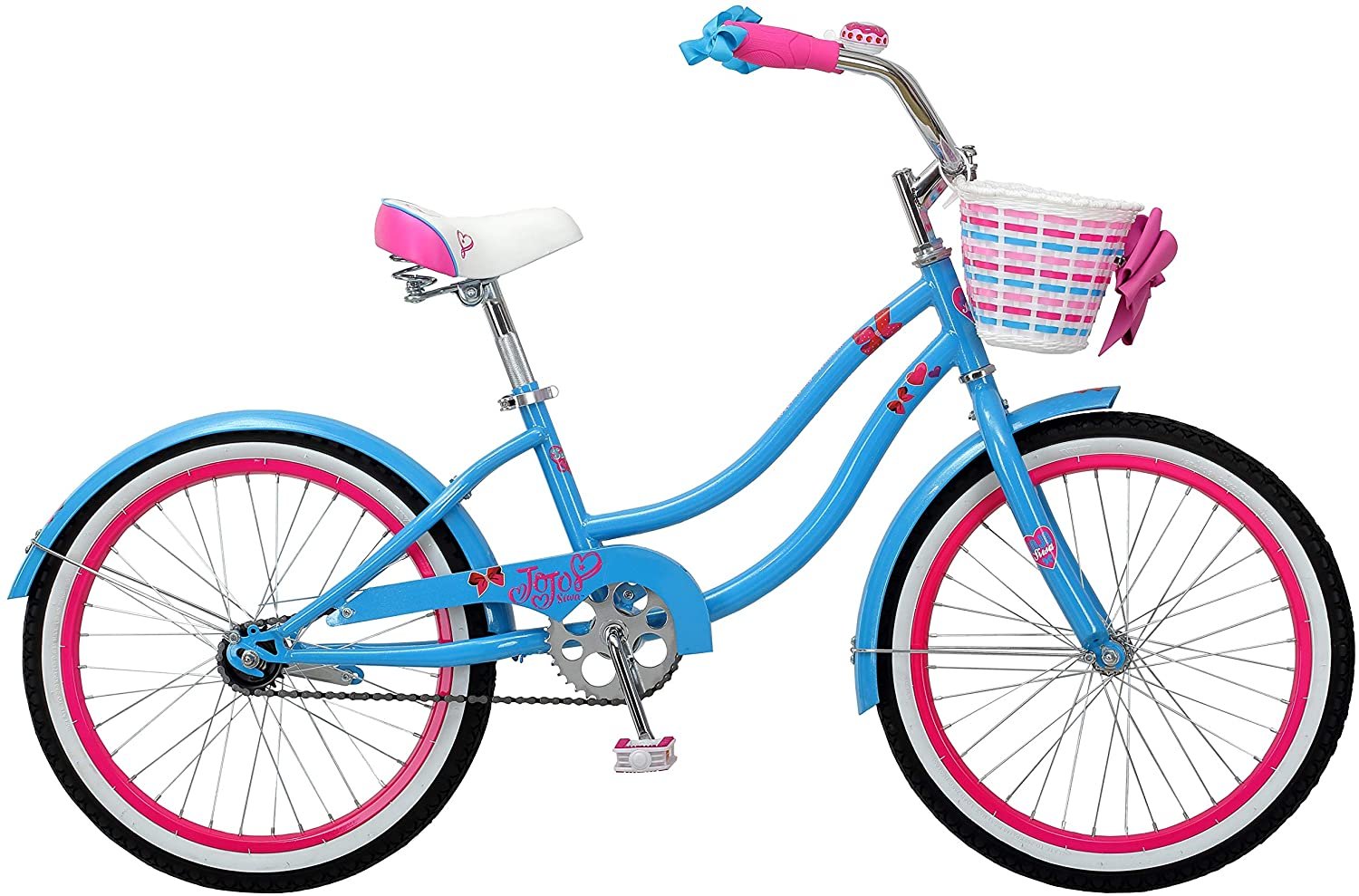 Kids’ bike with 20-inch wheels fits riders ages 6 and up or 4 to 5 feet tall. Jojo Siwa cruiser style bike that’s great for fun rides around the neighborhood.