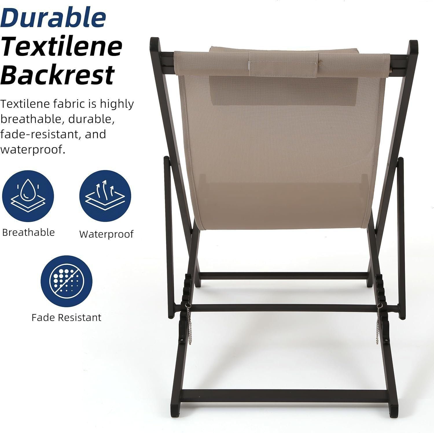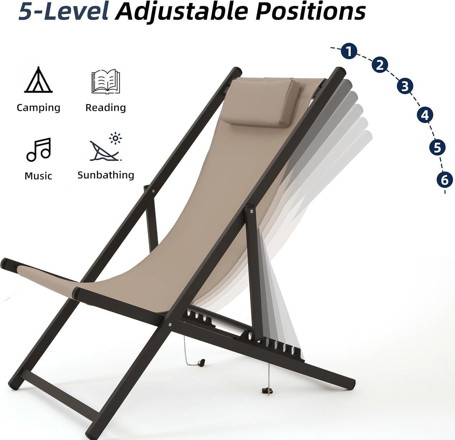The sling chairs have six adjustable positions, allowing you to find the perfect angle for your seat and headrest. The snap lock mechanism ensures maximum comfort and relaxation.