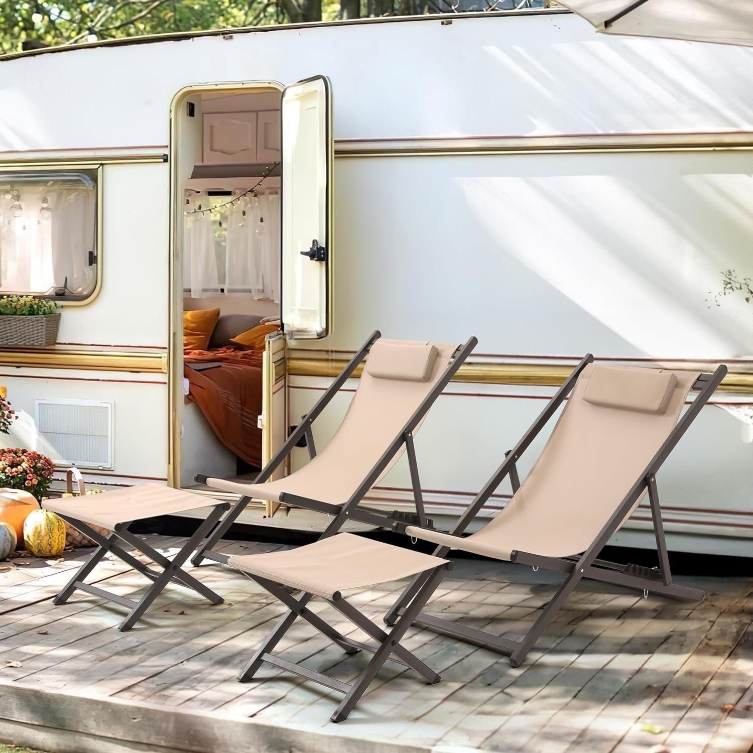 Patio Deck Chairs Folding Chair Set of 4 with 2 6-Level Adjustable Aluminum Folding Chairs and 2 Stools