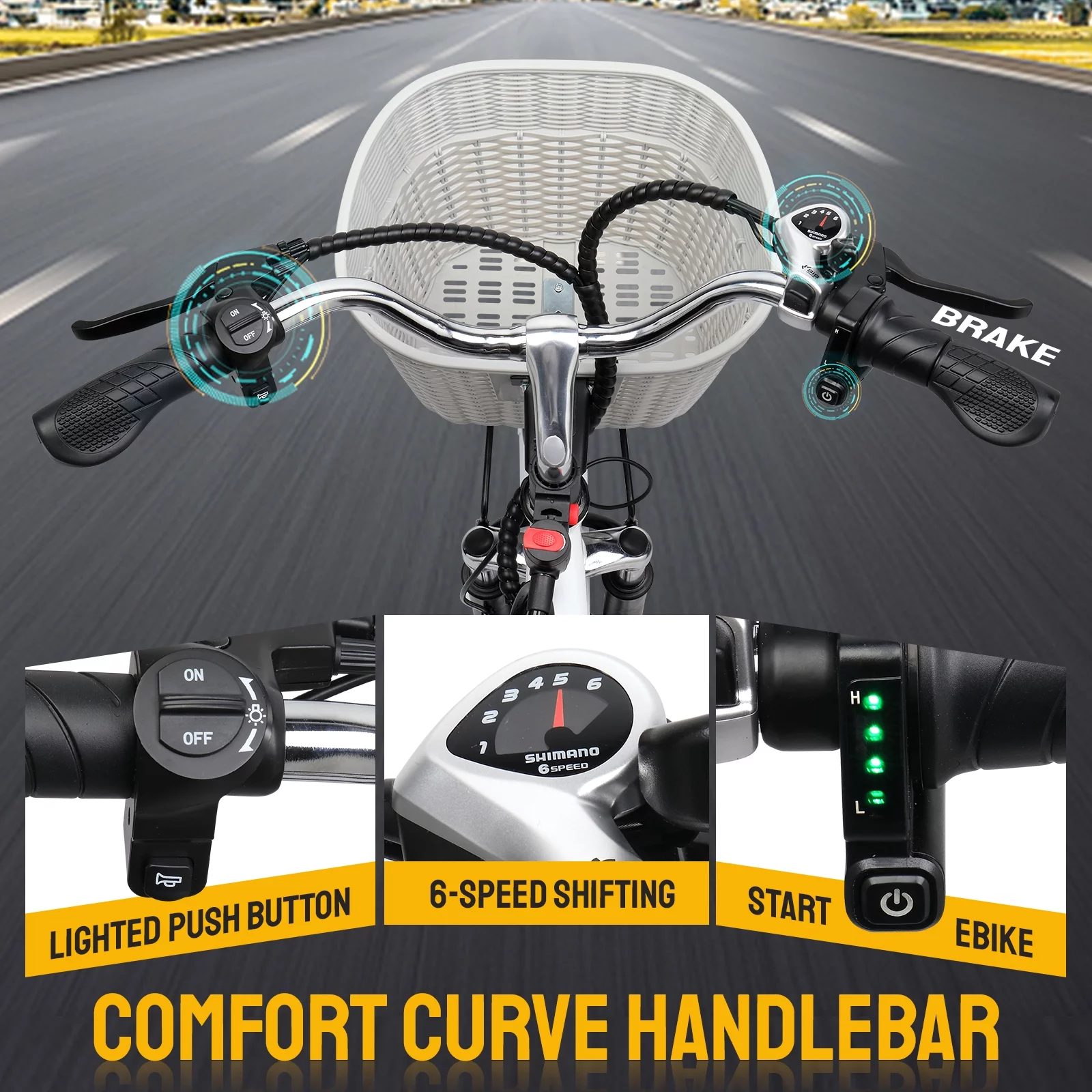 ??LASTING BATTERY & 3 RIDING MODES??The 36V 12.5AH large capacity removble lithium battery.The BMS technology provides the safety of the battery. There are Ordinary Bicycle, PAS Mode, Electric Mode 3 riding modes.The electric mode can travel 45-50 KM/28-31 Miles.The PAS Mode can travel up to 70-80 KM/43-50 Miles.It can meet your daily commuting needs. ??POWERFUL MOTOR & SHOCK ABSORPTION??-Powerful 350W high-speed brushless motor provides stronger climbing power, the max speed can reach 15.5MPH(25KM/H). You can easily handle most hills you come across. The front fork suspension can comfortably adapt to various road sections.It can shock absorption for more safe and comfortable riding. ??SHIMANO 6-SPEED GEARS & DUAL DISC BRAKES??The professional Shimano 6-speed gear finger shifters convenient to ride uphill, downhill or pure acceleration. The front and rear dual disc brakes provide gstable and strong braking force.Front and rear reflectors, LED Headlights and seat with light for safe riding. ??DURABLE & COMFORTABLE DESIGN??-It is made of high-strength carbon steel frame and superior bike paint.The non-slip and wear-resistant.It has strong grip and puncture resistance to ensure safe driving.The max load capacity is 265LBS/120KG.Adjustable seats and handlebars can provide you with comfortable riding posture. Large-capacity basket and passenger seat (back seat rack) is convenient for your daily life and shopping. ??EASY TO INSTALL & CONSIDERATE SERVICE??-Assemblied 90% before shipment,with detailed instructions and installation tools, you can easily complete the installation.You can scan the QR code tag on the front of the car to view the detailed installation video.If there is damage or failure with bike, pls find us by your order and send us the relevant photos and videos of the problem.