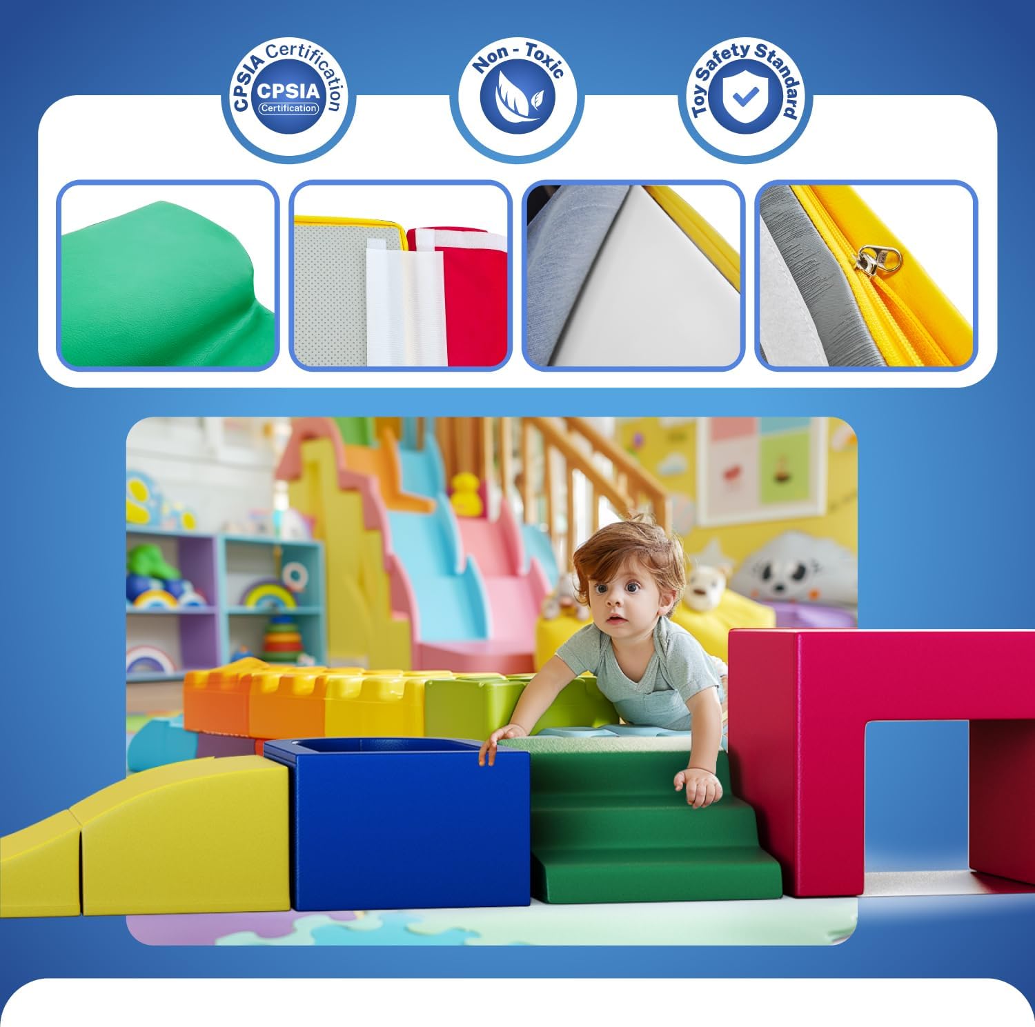 Certified to meet CPSIA/ASTM F963-17 standards, our climbing toys for toddlers are safe for your child. They are non-toxic, eco-friendly, odorless, and made from high-quality materials that promote healthier indoor air. This soft play set for toddlers 1-3 ensures a safer environment, allowing parents to feel more confident about their kids’ playtime.