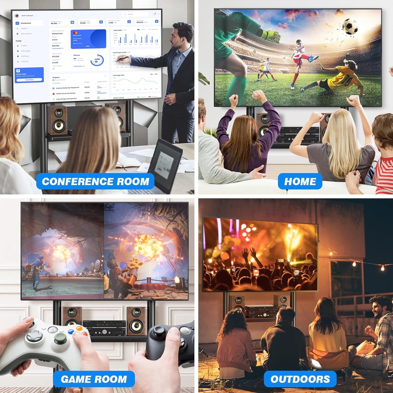 - EFFORTLESS MOBILITY & WHISPER-QUIET WHEELS – ENJOY YOUR FAVORITE TV SHOWS ANYWHERE: Our modern TV cart has 4 sturdy, lockable wheels that can glide seamlessly over floors, carpets and tiles; And you don’t have to worry about damaging your floor or carpet; What’s more, each wheel is equipped with a secure locking mechanism, ensuring that your TV stays exactly where you want it; So you can enjoy your favorite TV shows wherever you want