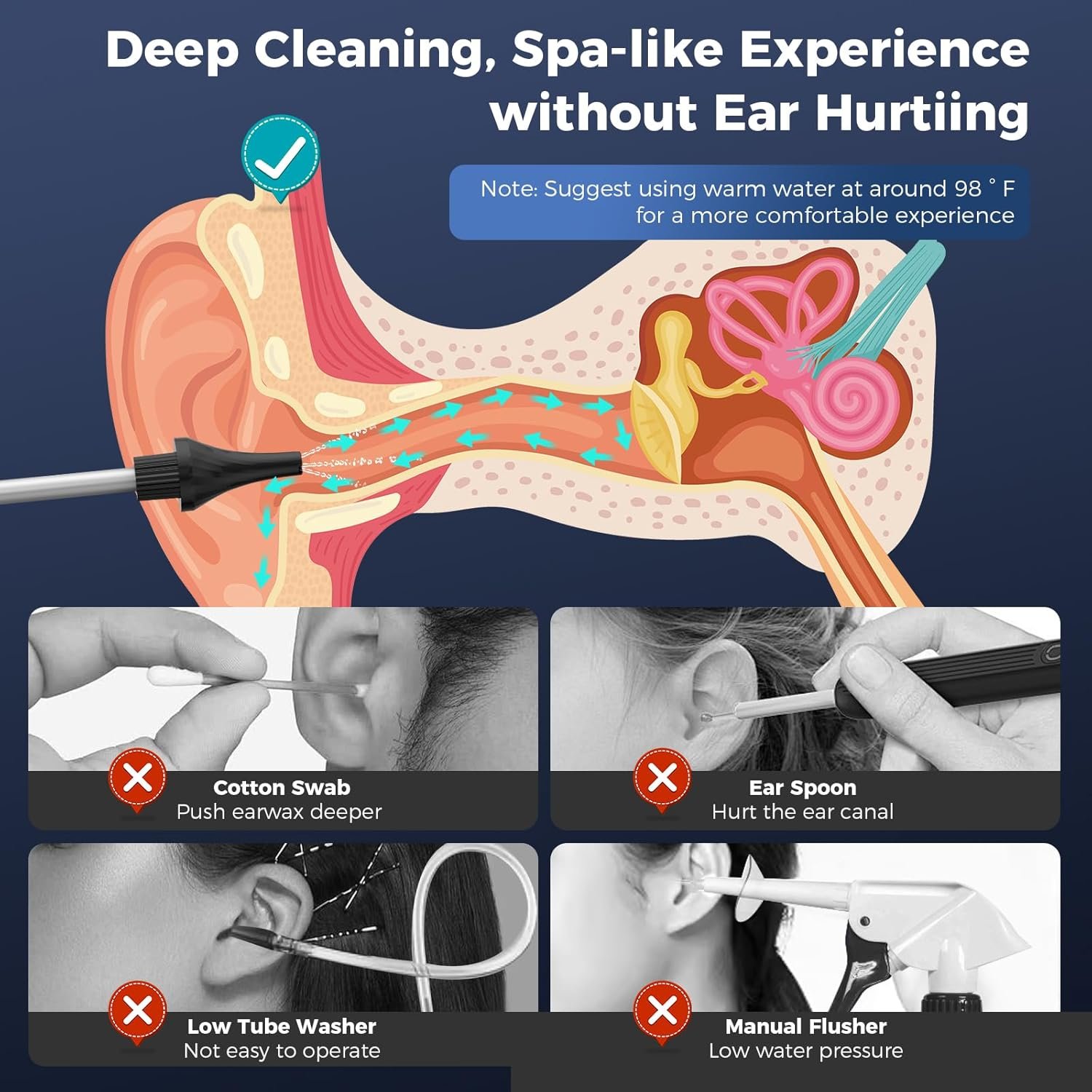 - IPX7 WATERPROOF DESIGN: Our ear wash kit features IPX7 waterproof technology, allowing you to use it in the shower or rinse it with water during regular maintenance without worrying about damaging the earwax. The compact size makes it easy to carry around, ensuring that you can enjoy clean and healthy ears wherever you go.