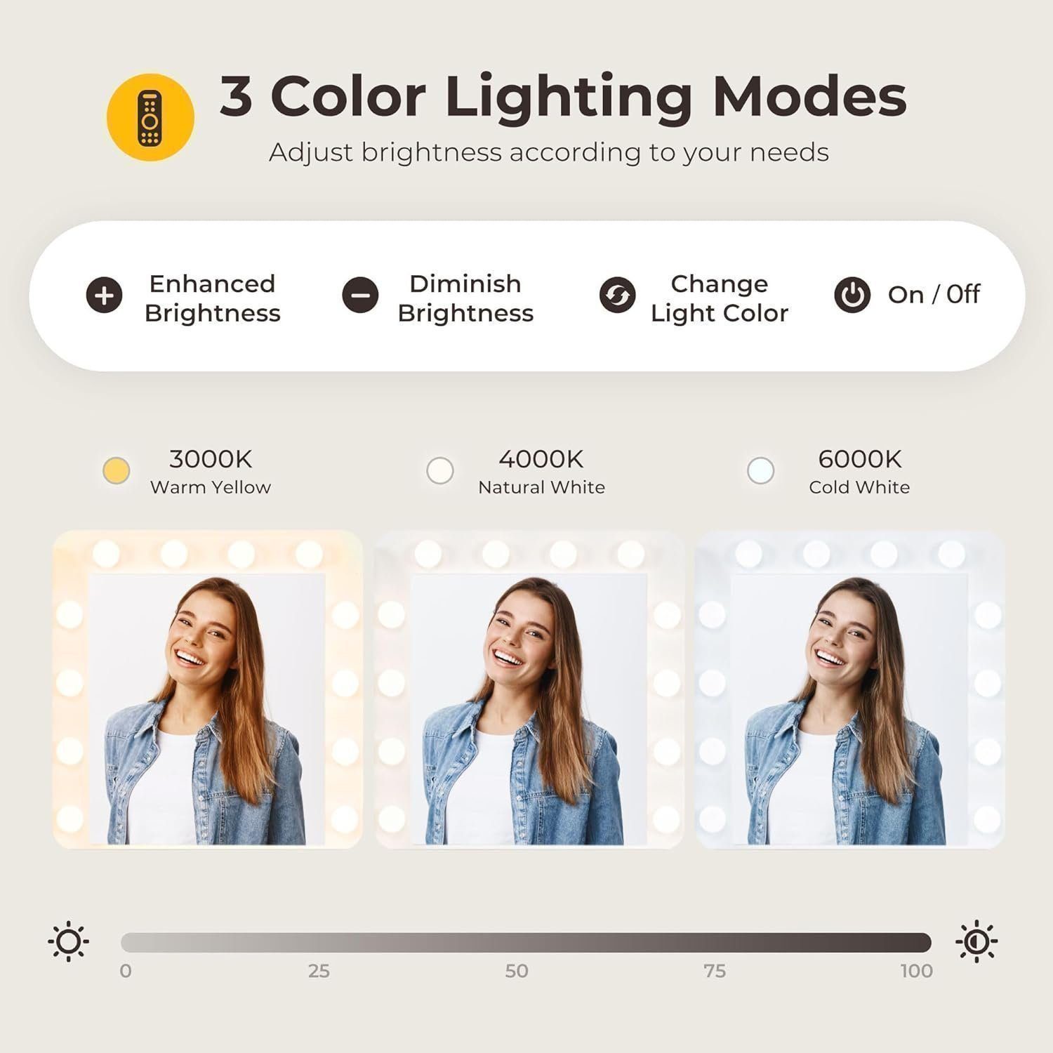 You can adjust different light modes (cold white, warm white, warm yellow) by button, and the brightness of each mode can be adjusted to help you create a perfect makeup look.
