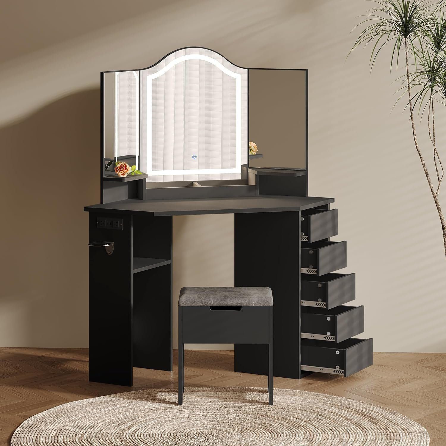 Beautiful Corner Vanity: Our tri-fold mirror features a unique and aesthetically pleasing design, with built-in light strips offering three modes for your selection.