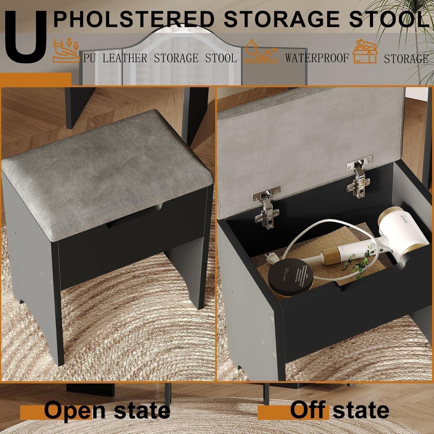 Upgraded Soft Cushioned Stool: The vanity set comes with a soft cushioned storage stool made of faux leather and sponge, adding extra comfort to your beauty routine.
