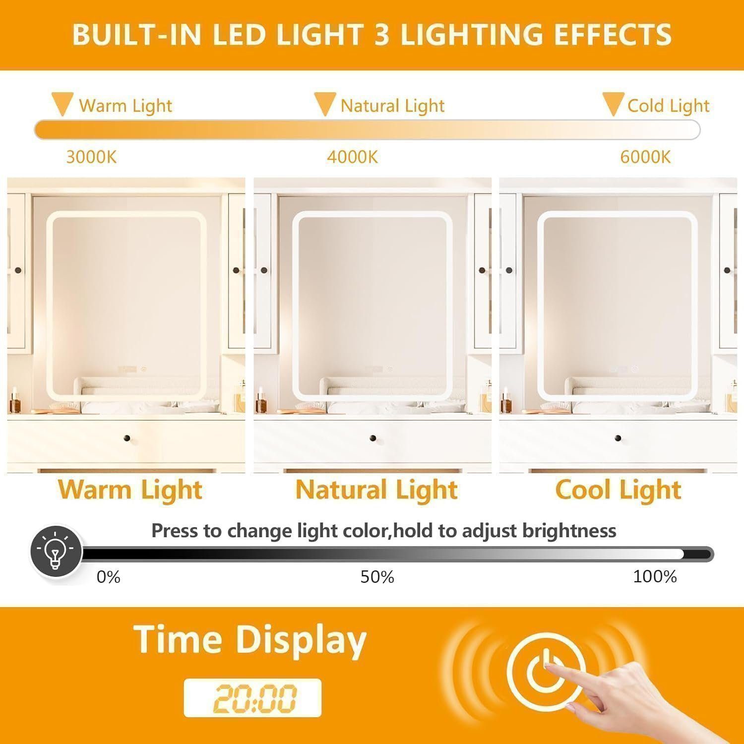 Bright LED Light with 3 Color Modes : This vanity has a HD mirror built-in makeup light strip.
