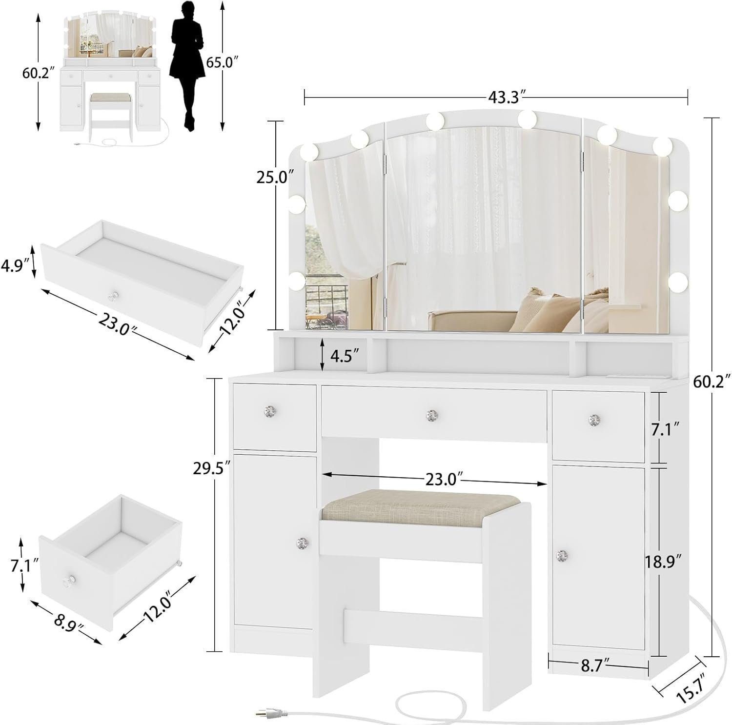 Vanity Desk with Triple Folding Mirror, Makeup Vanity with Power Outlet, Vanity Desk with 10 Lights