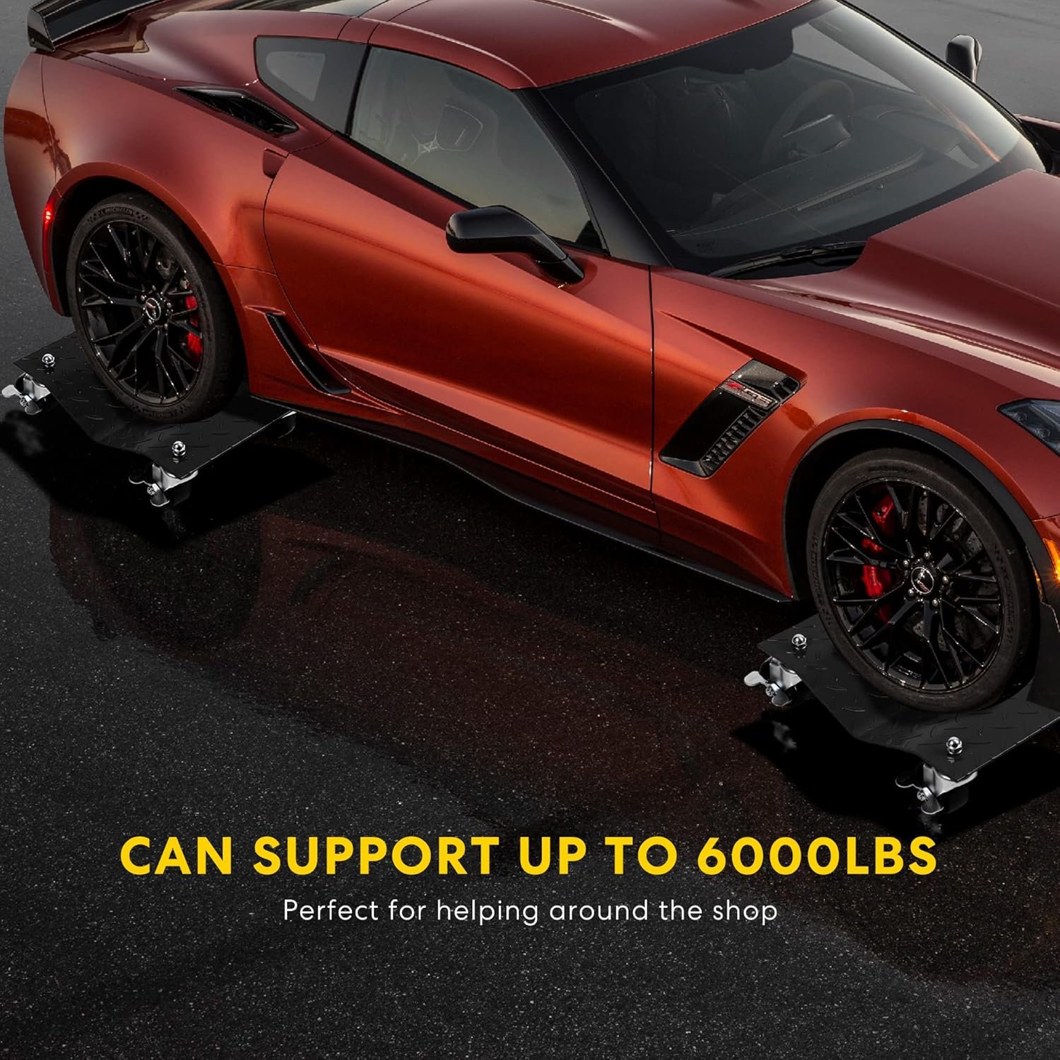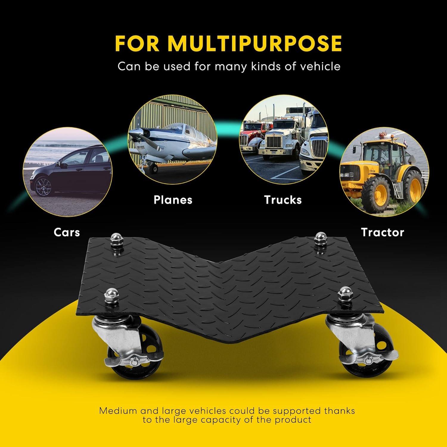 - LARGE WEIGHT CAPACITY – Each car dolly consists of a plate measuring 16 x 11.7 inches (L x W) and 4 wheels measuring 3 inches in diameter, making it able to support up to 1500 lbs. (6000 lbs. In total); This set of 4 tire skates make moving vehicles of medium and heavy wheels a breeze