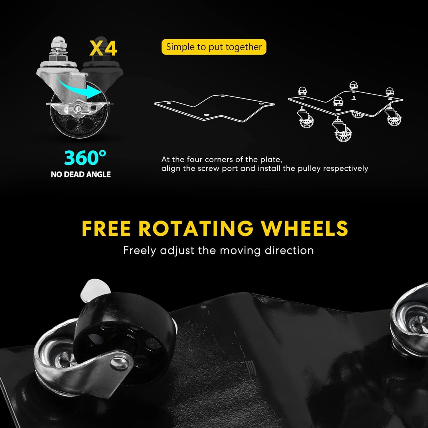 - UNIVERSAL WHEELS – 4 swivel casters allow for mobility in all directions, which is suitable for single-person work; Each dolly is equipped with 2 wheels that have a braking function for quick stops; Note: The braking wheels should be assembled on the same side