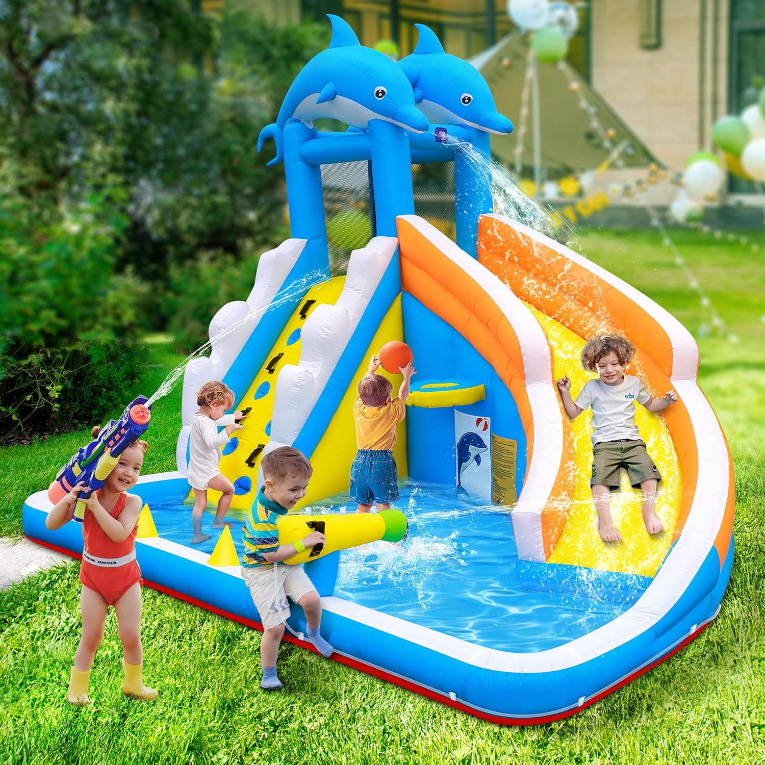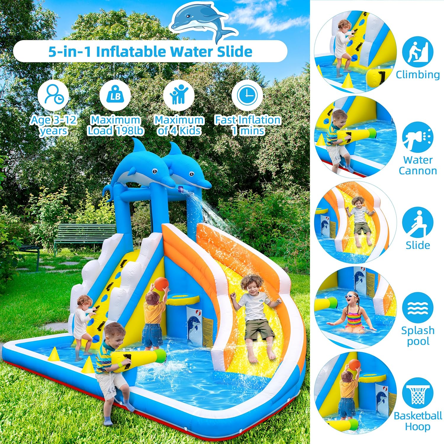 Water Slide,5 in 1 Dolphin Inflatable Bounce House for Kids- Climbing Wall Splash Pool Water Cannon Basketball Rim – 480W Blower – for Indoor Outdoor Backyard Birthday Party