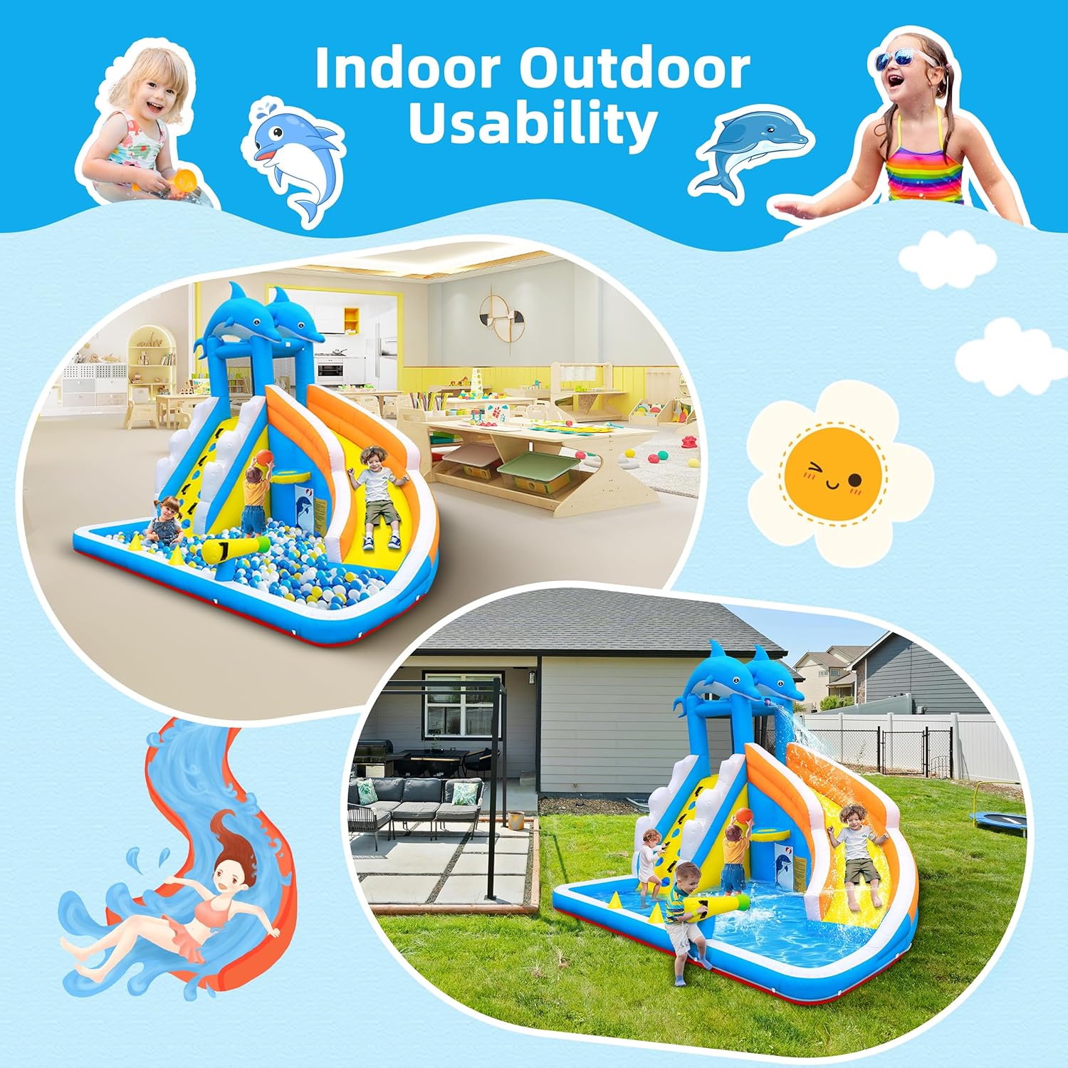Be the first to review “Water Slide,5 in 1 Dolphin Inflatable Bounce House for Kids- Climbing Wall Splash Pool Water Cannon Basketball Rim – 480W Blower – for Indoor Outdoor Backyard Birthday Party” Cancel reply