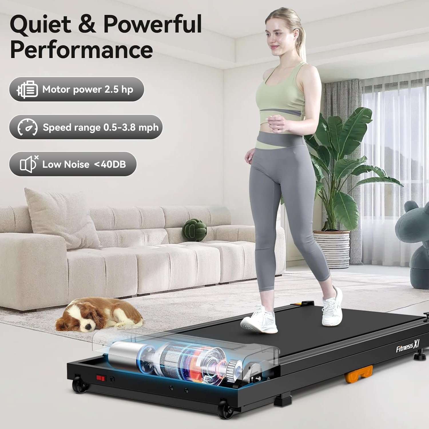 - Powerful, Quiet 2.5hp Motor: Our treadmill features a powerful 2.5hp motor operating below 40 DB, ensuring a quiet workout experience, perfect for home use. Support up to 300 lbs with confidence. Invest in this reliable walking pad treadmill for home fitness.