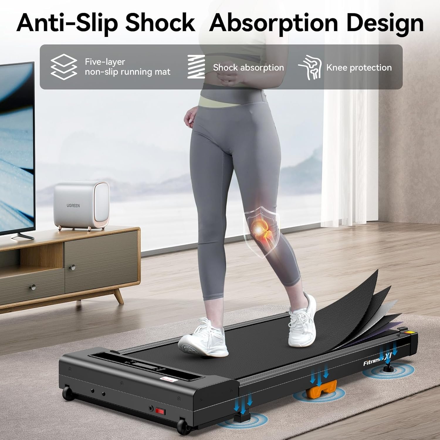 - 5-Layer Shock-Absorbing Belt: The walking pad features a 5-layer shock-absorbing running belt (16″ W*43″ L) with 6 cushioning points protects your joints and knees while designed to prevent misalignment and enhance safety. Add this joint-friendly walking pad treadmill to your home exercise routine.